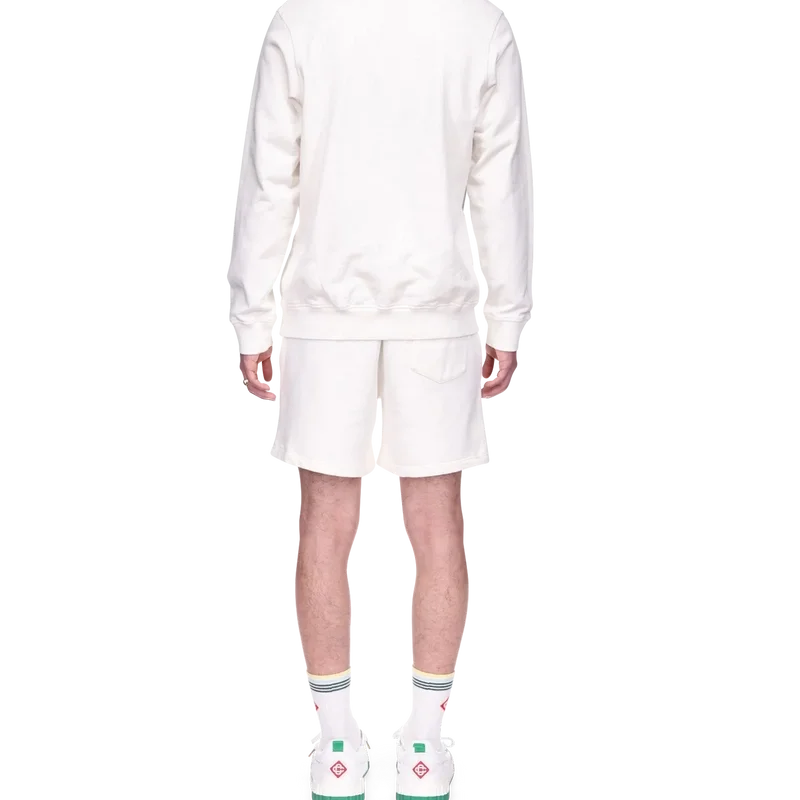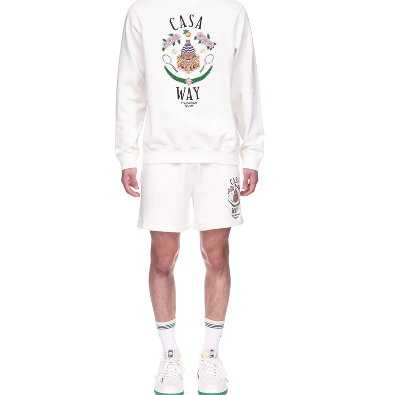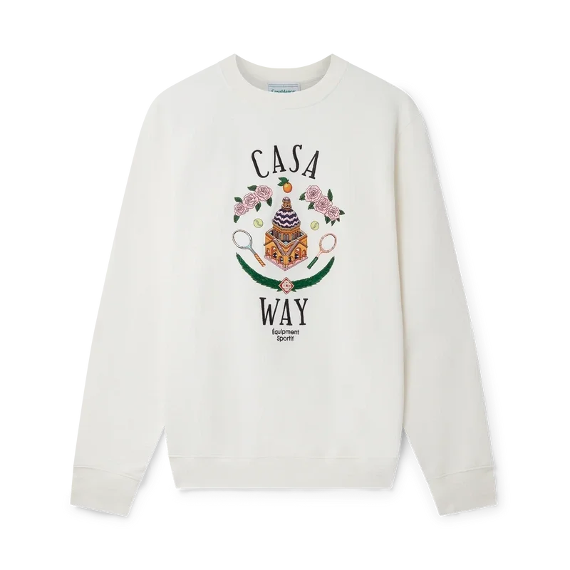 Casa Way off-white unisex-genser har broderte illustrasjoner av sportsutstyr og blomsterdetaljer. Modellen er laget av økologisk bomull, har en klassisk rund hals og lange ermer, og er designet for en avslappet passform.