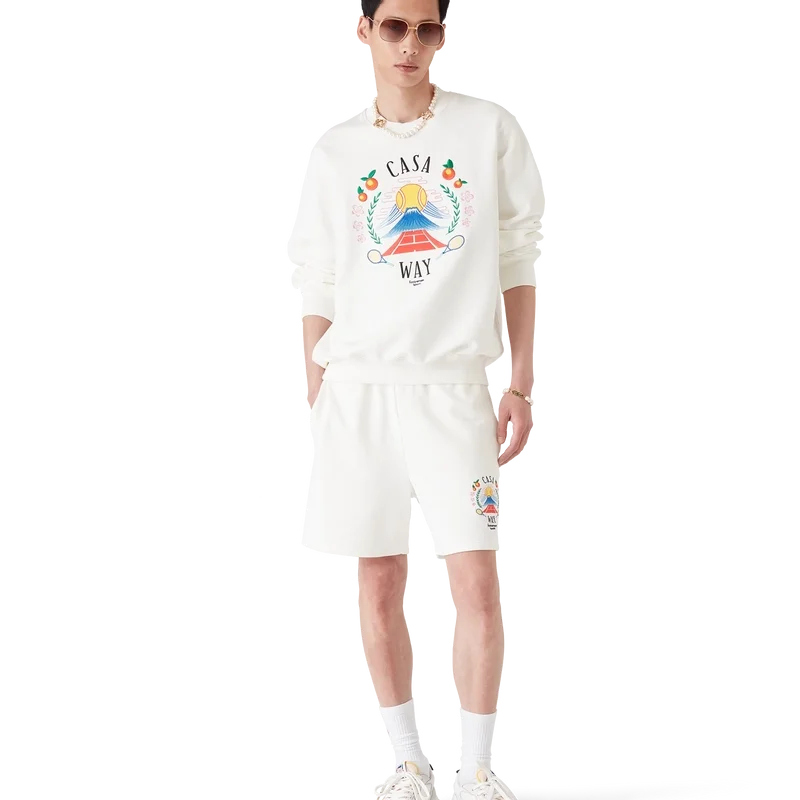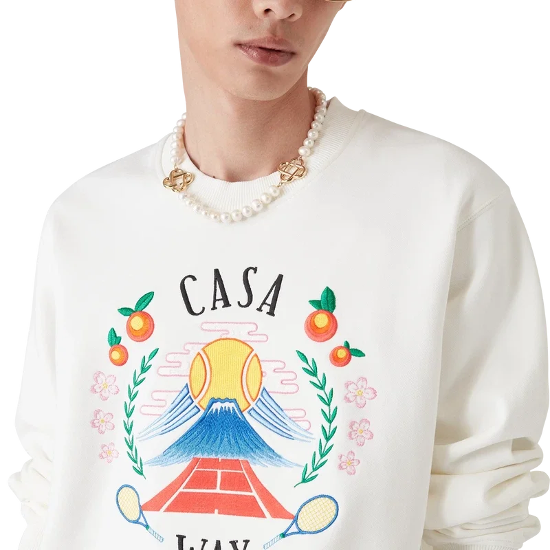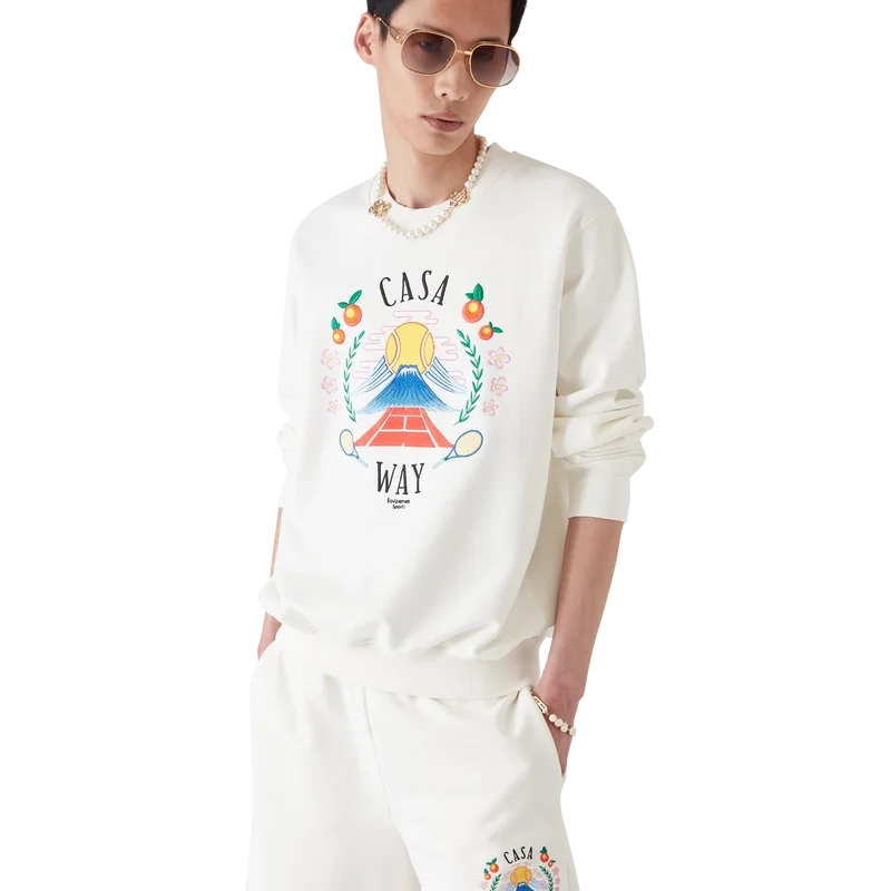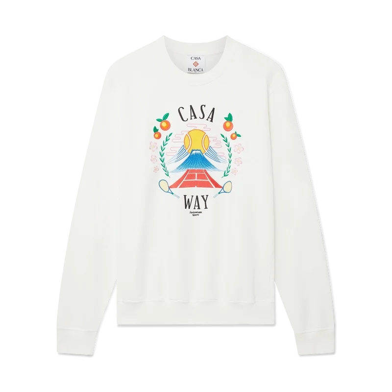 Casa Way Mountain hettegenser er en langermet modell laget av økologisk bomullsstoff og har husets sesongbaserte kunstverk tolket på nytt for denne sesongen. Utstyrt med hette med snøring, kengurulomme foran, ribbestrikkede mansjetter og nederkant.