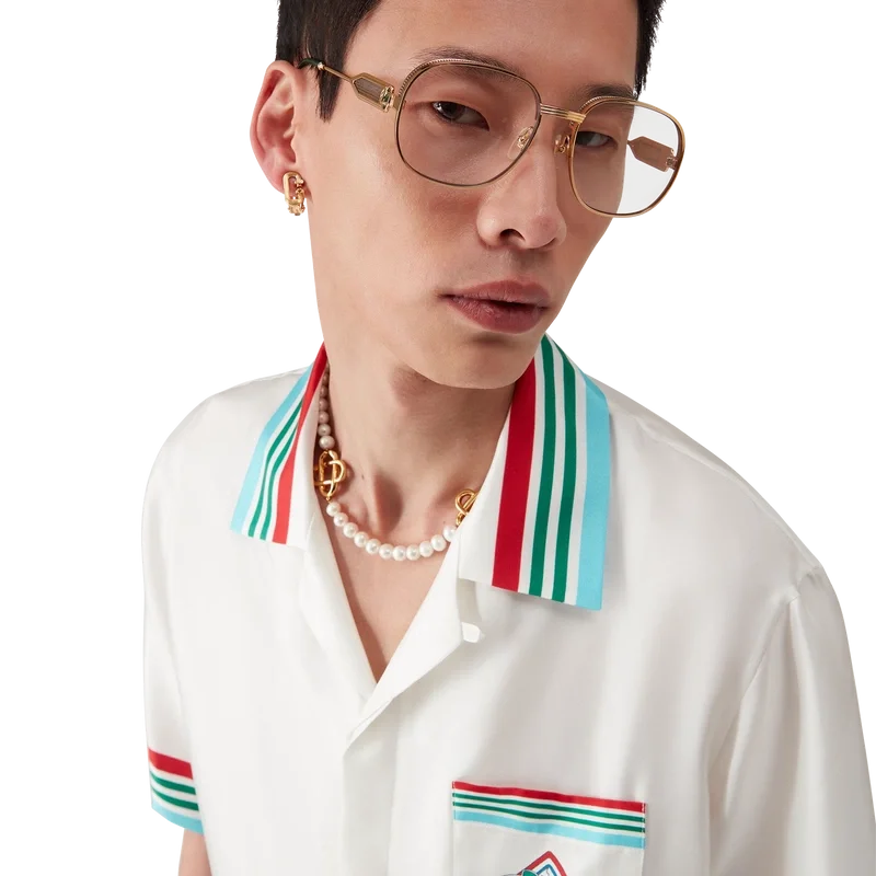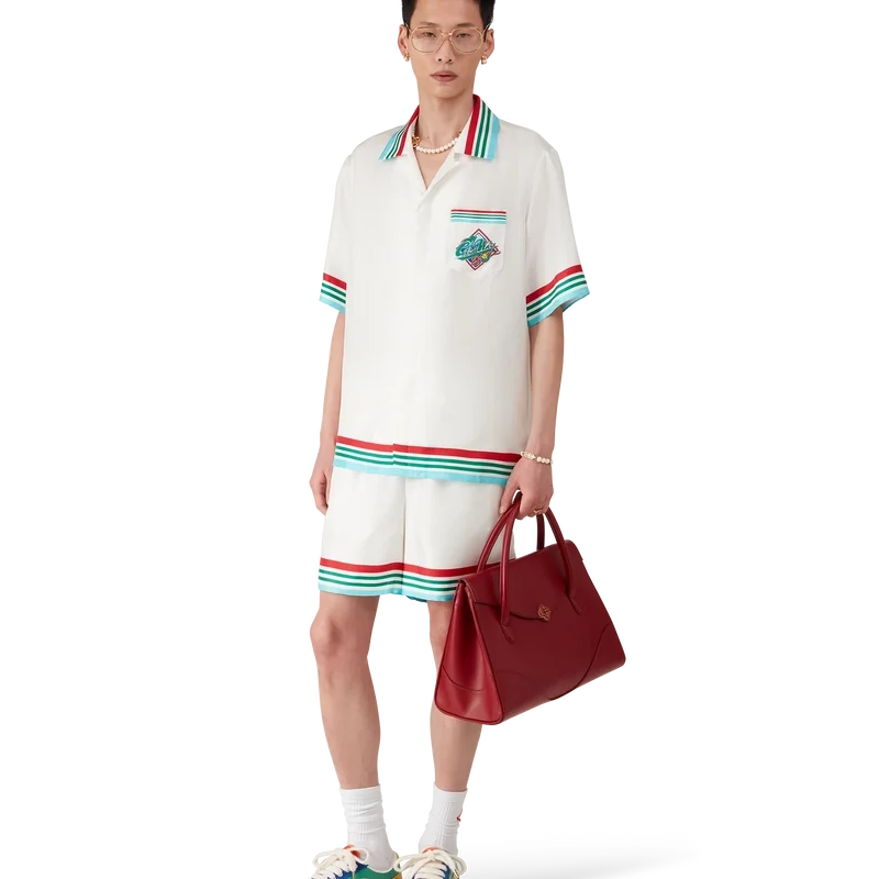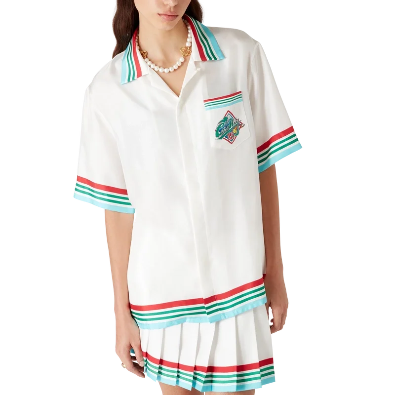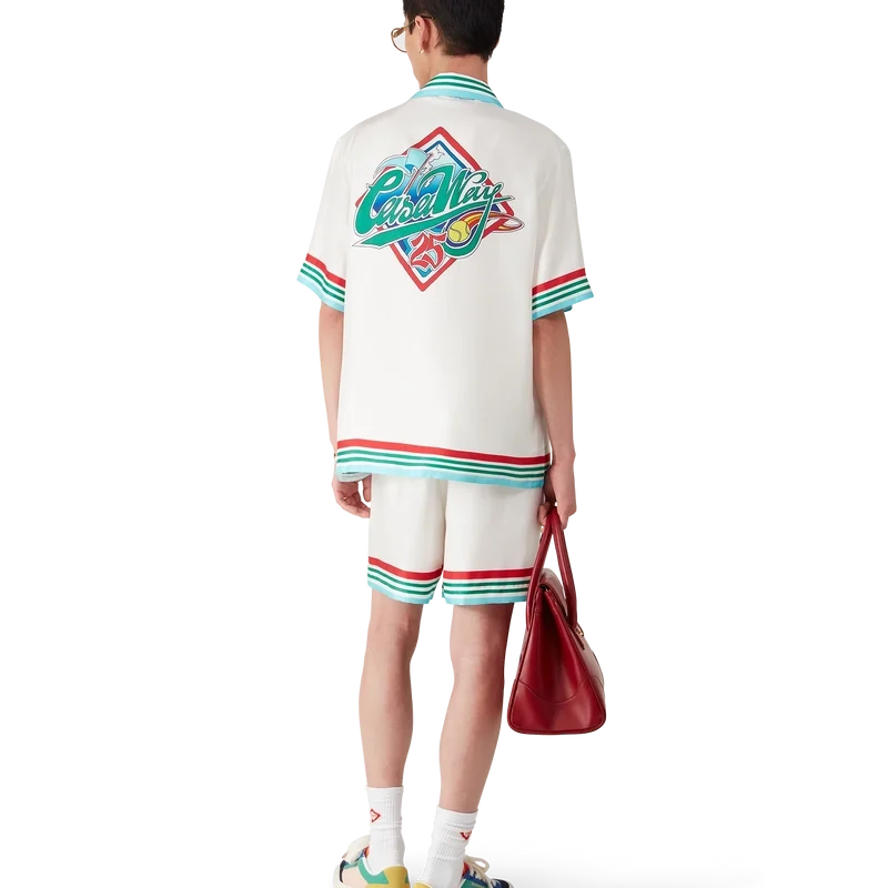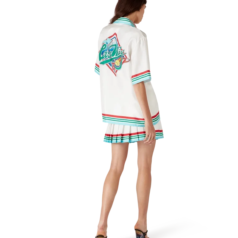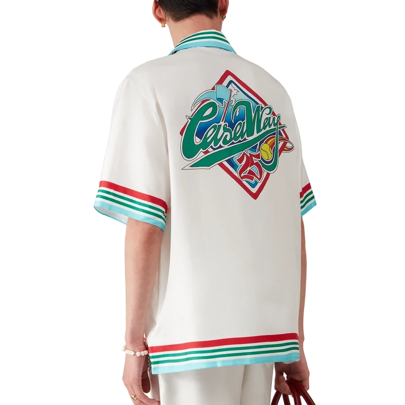Casa Way World Series silke-skjorte er en kortærmet skjorte med trykk som viser sesongens kunstverk, en ny tolkning av klassiske amerikanske baseball-symboler for Casa Way Tennis, laget av silketwill.