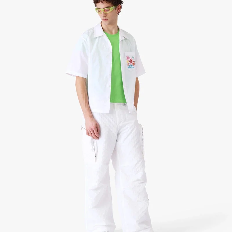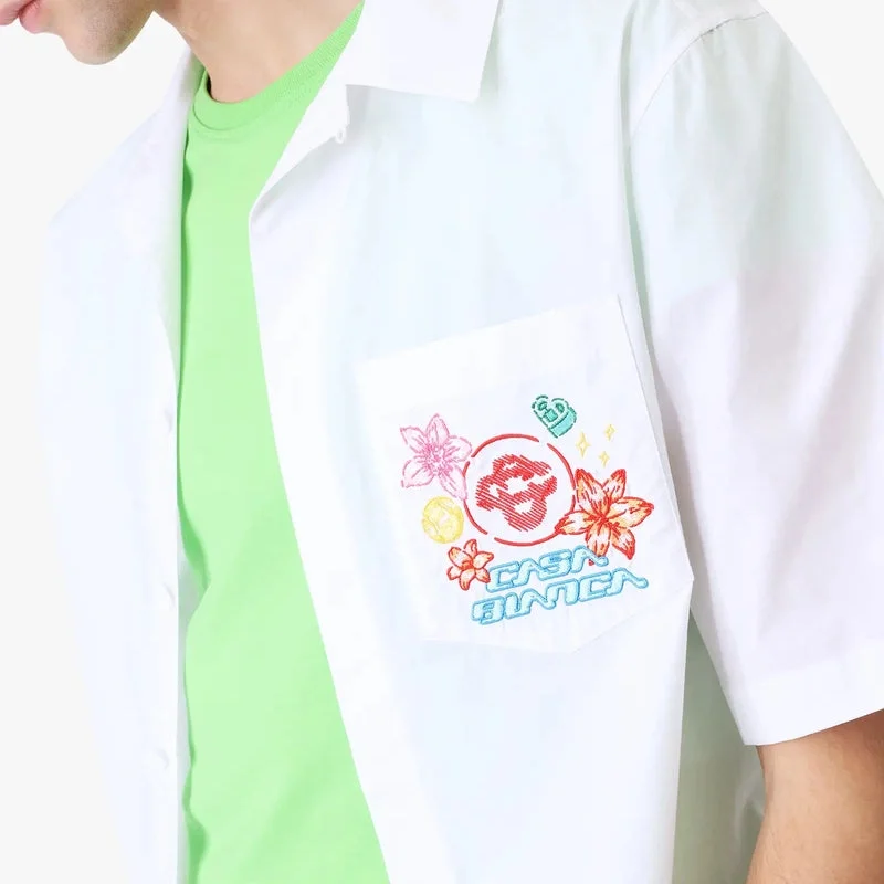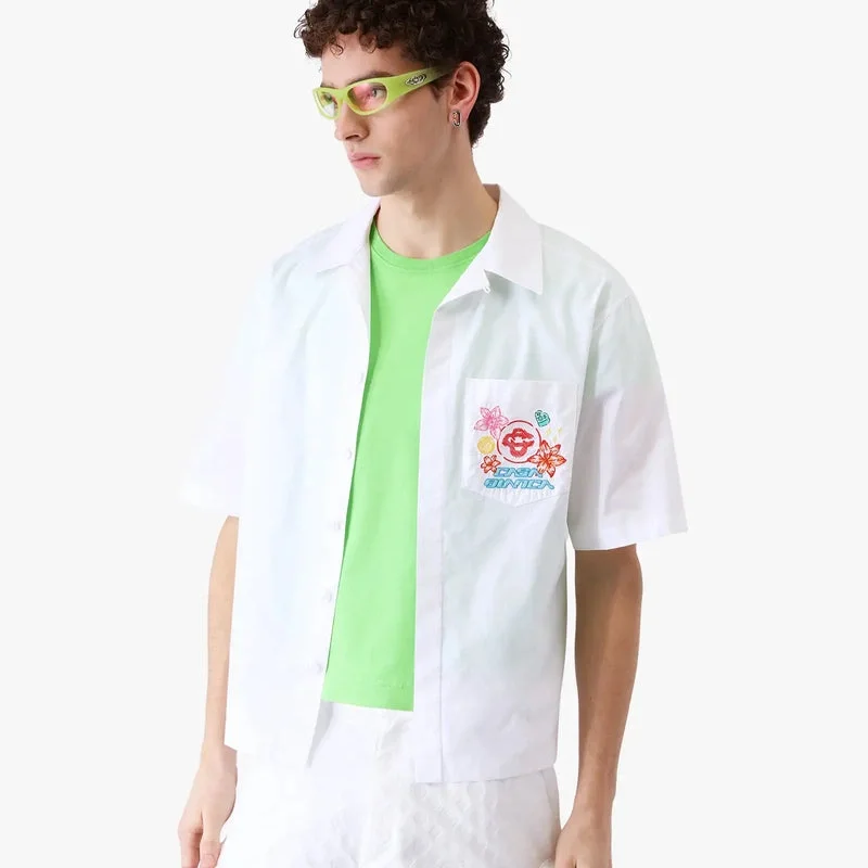 Den broderte kortærmede skjorten Collage D’icones Graphiques har et raffinert design med kunstverk som representerer ikonografien og designelementene for den nye sesongen, inkludert tolkninger av logoen, Cc Smile og orkideblomsten. Fullført med krage, knappelukking og brystlomme.