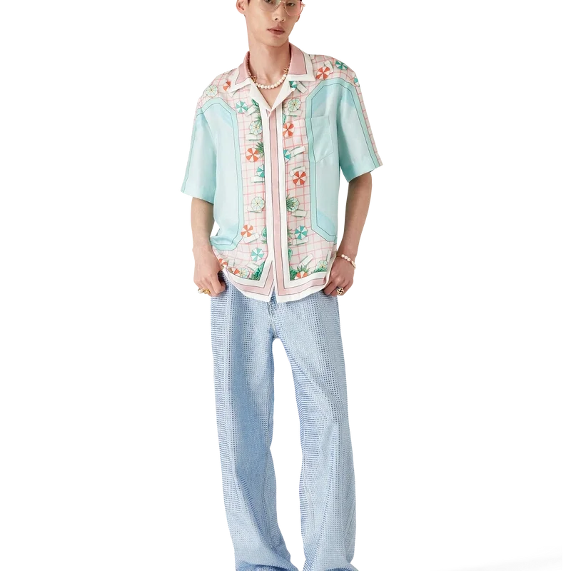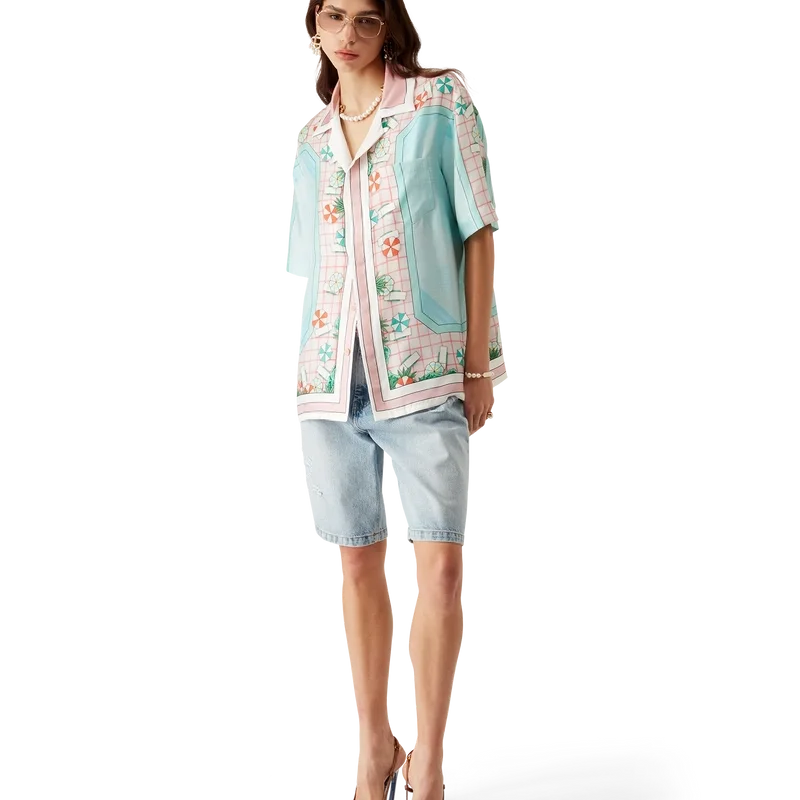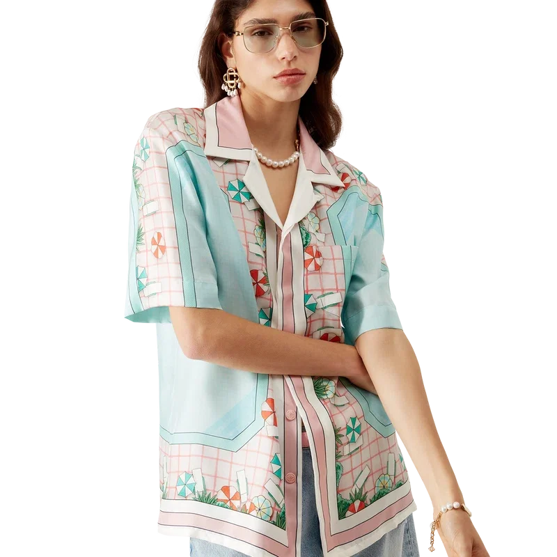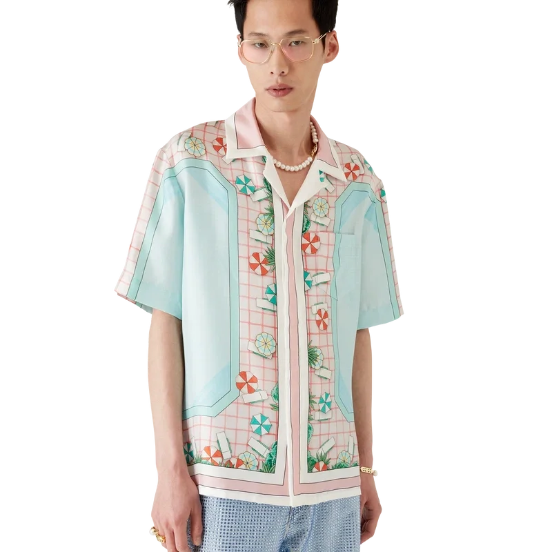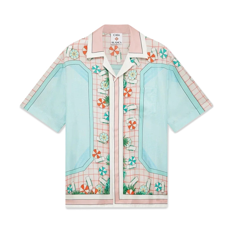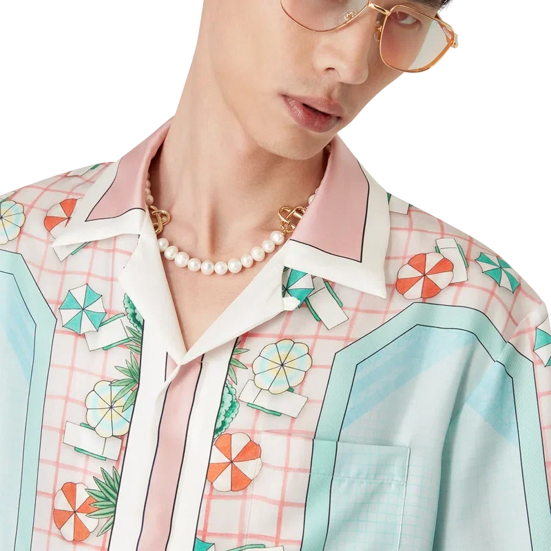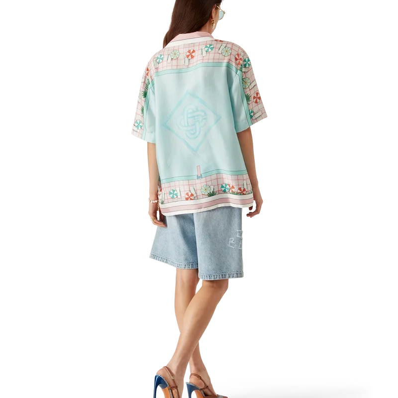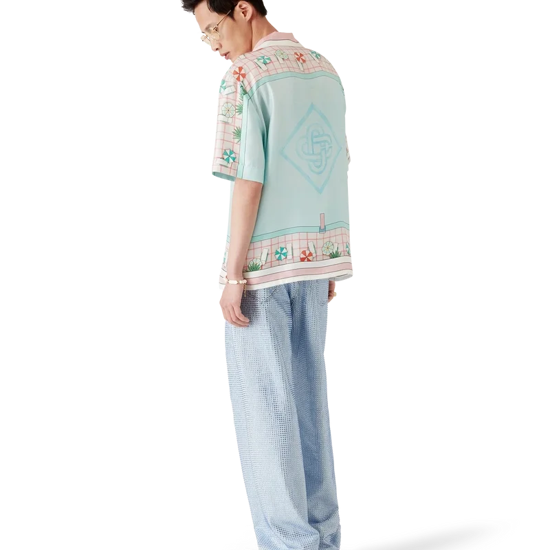 Copacabana kortærmet silkeskjorte er et heltrykt design med husets signaturkunstverk, inspirert av et hotellbasseng og reiseidealisme, og viser en vakker dag ved bassenget sett ovenfra – noe som gir et nytt perspektiv – laget av silketwillstoff.