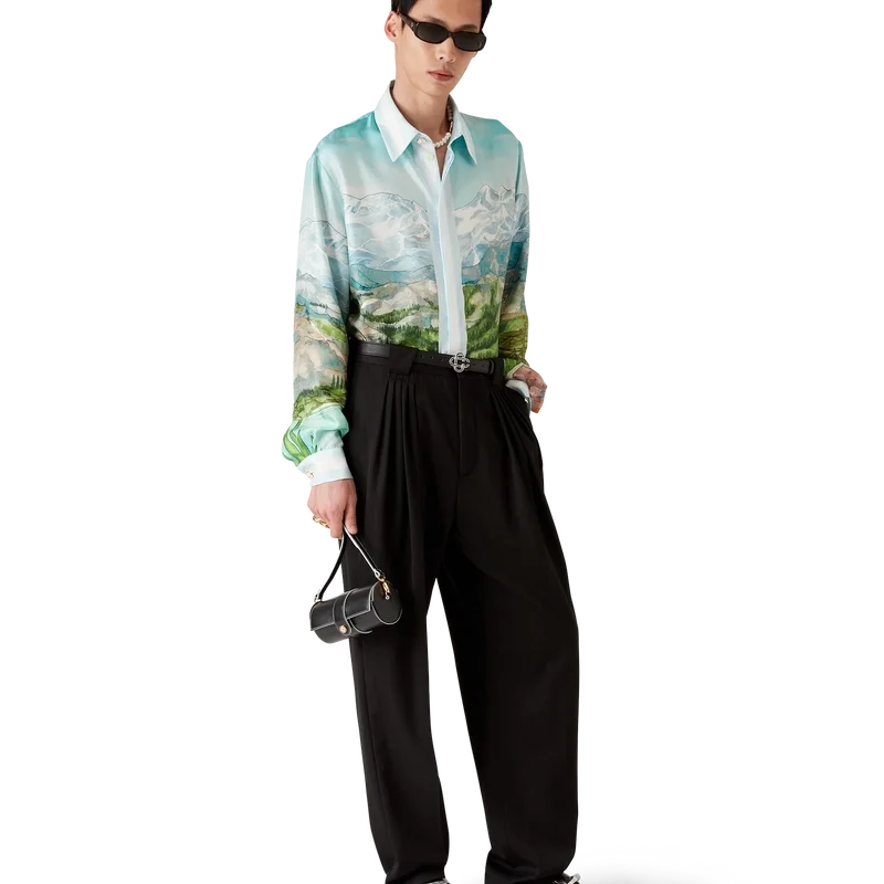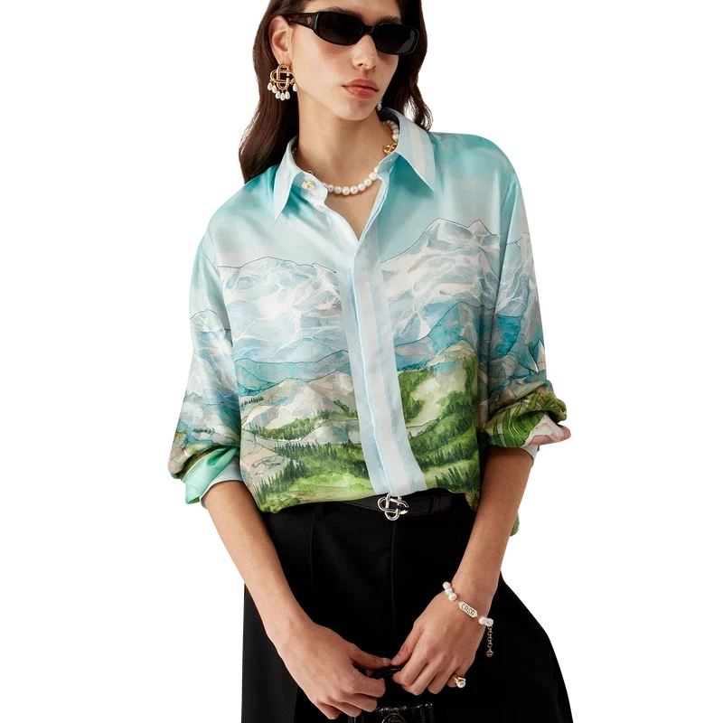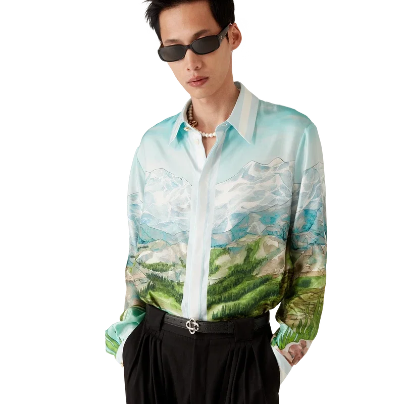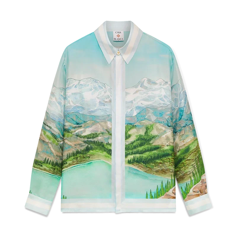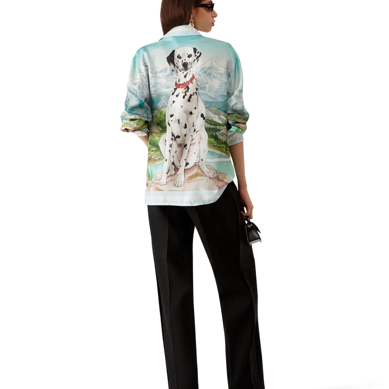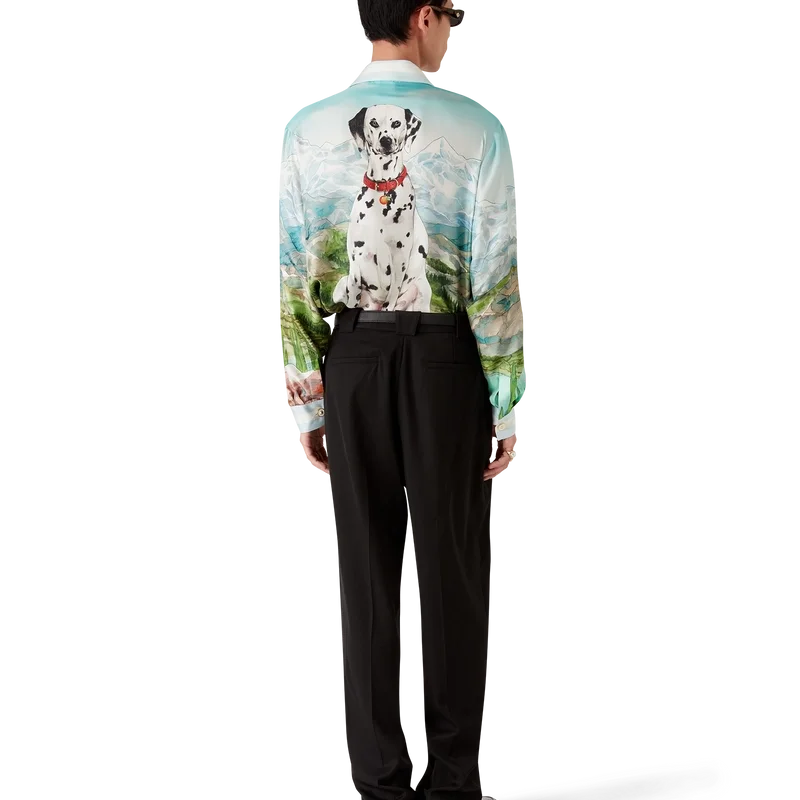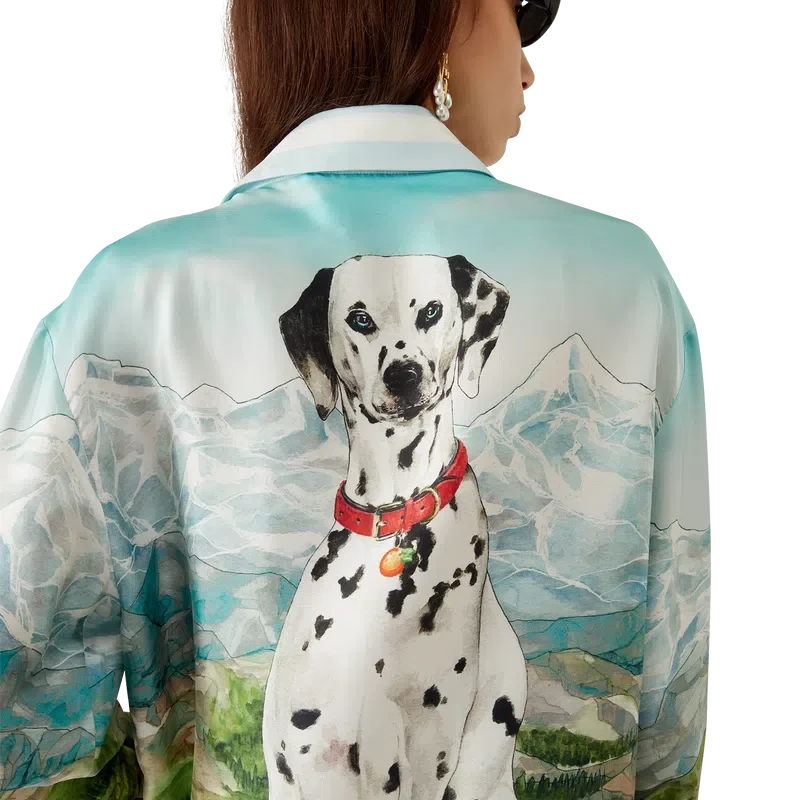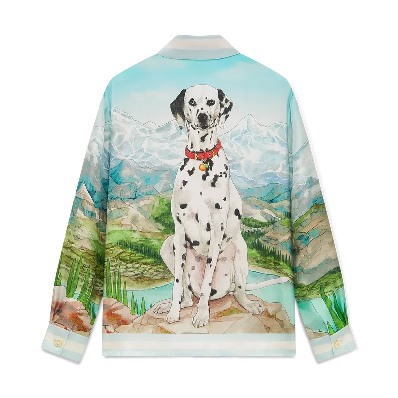 Dalmatian a La Montagne langermet silkeskjorte er et heltrykt design laget av silketwill med husets signaturkunstverk som skildrer et landskap med snødekte fjell, innsjøer og en dalmatiner.