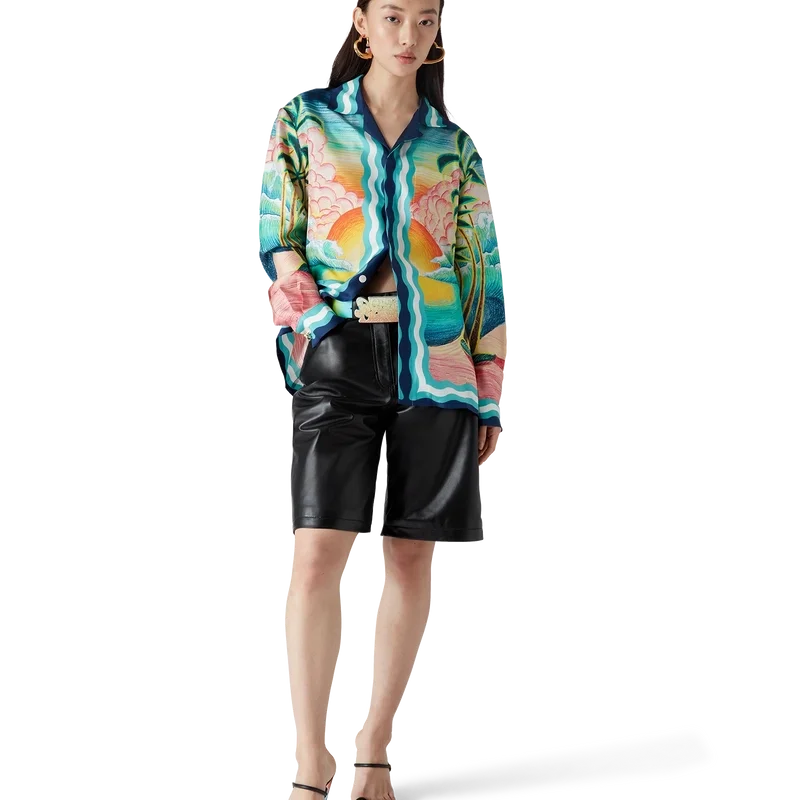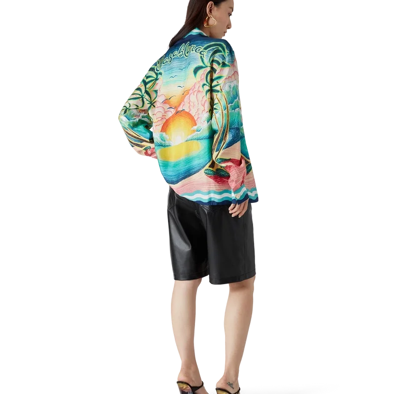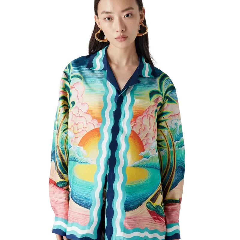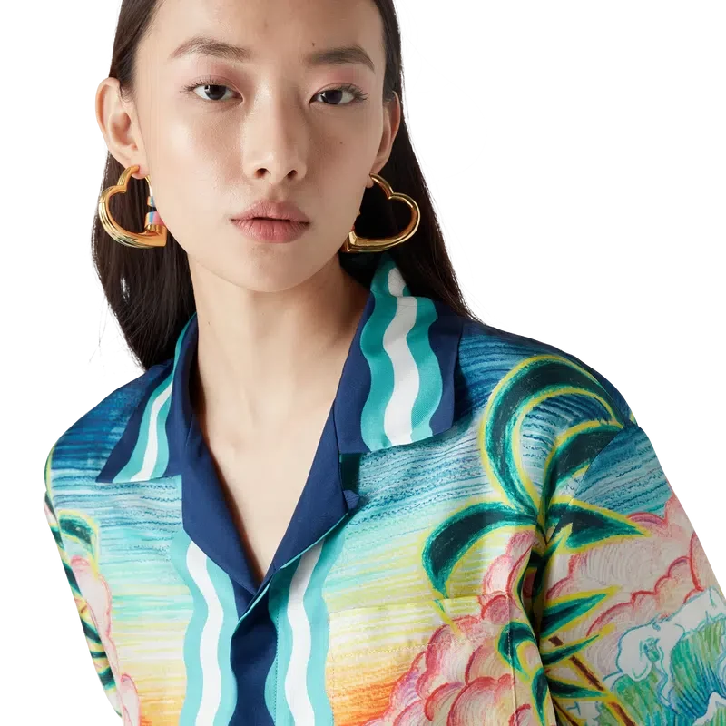 Danse De La Mer-silkeskjorten er en langermet skjorte med heltrykk, med håndmalte motiver laget spesielt for kolleksjonen og laget av silke. Den har knappelukking, sammenflettede Cc-logo-knapper i corozo, karakteristiske emaljeknapper med gullkant og striper inspirert av Memphis-bølgen på nederkant, mansjetter, krage og knappelukking.