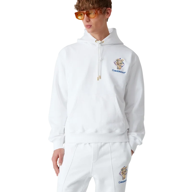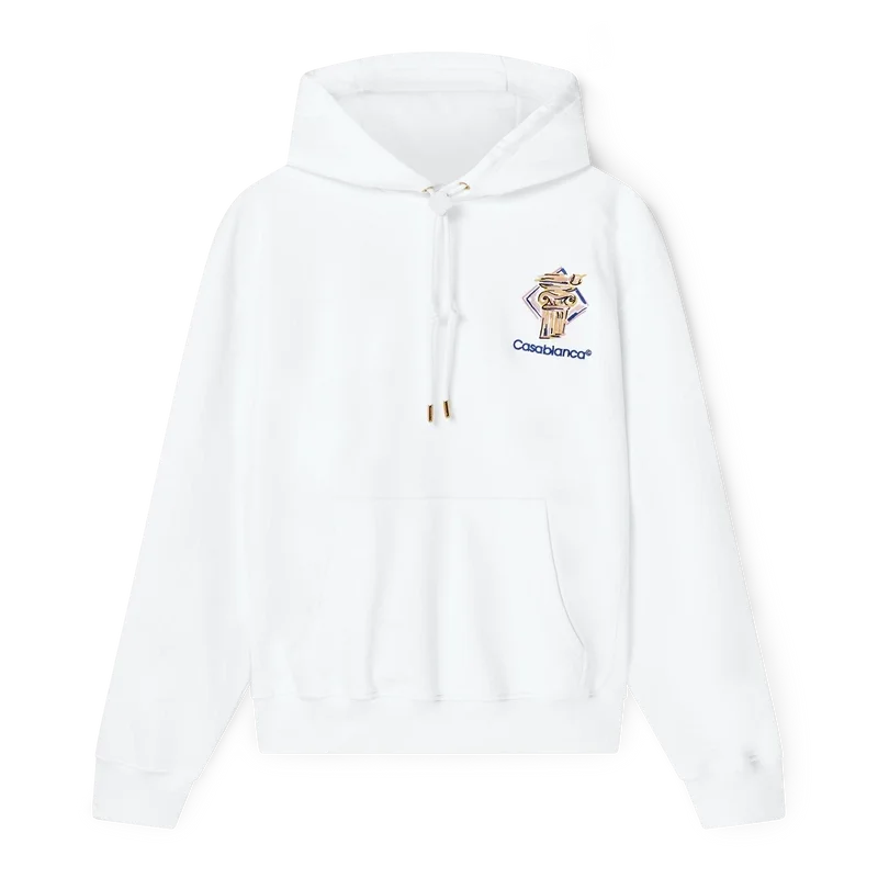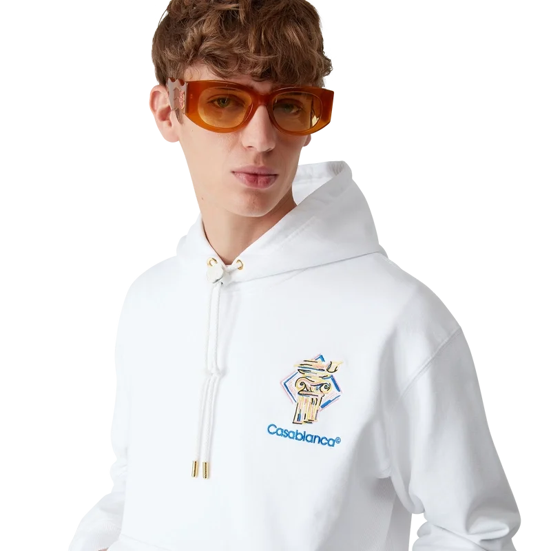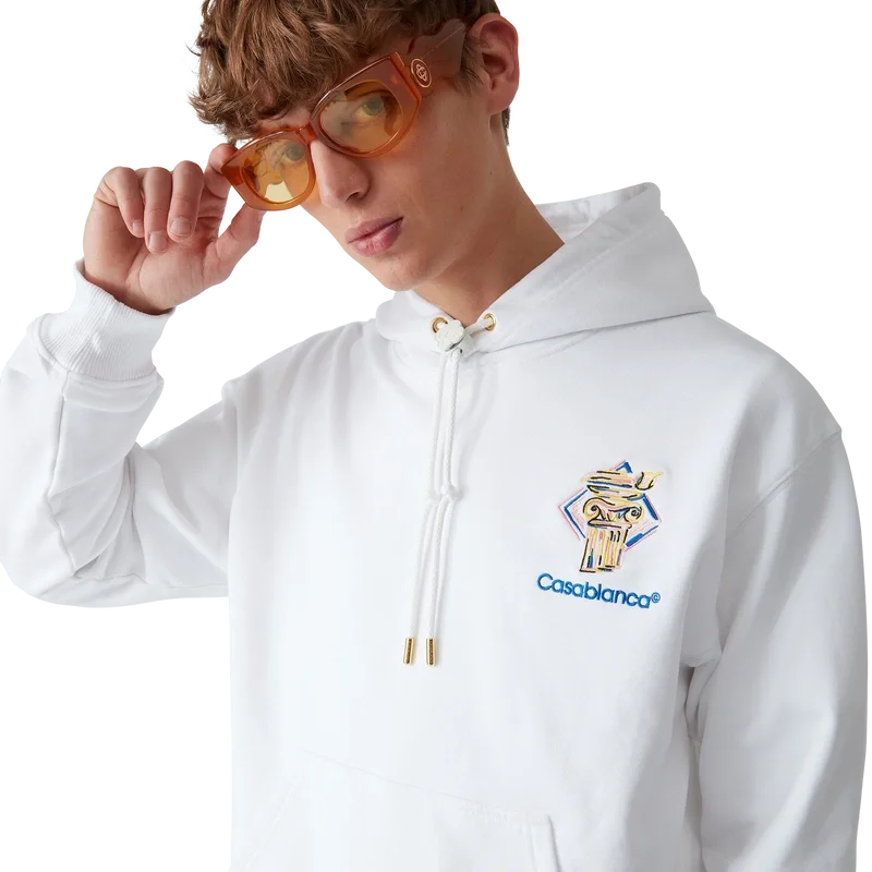 Diamond Column-hettegenseren er en klassisk langermet genser laget av økologisk bomullsstoff med husets ikoniske kritttegning av en søyle. Den har hette med snøring med gullspisser for sikker lukking, kengurulomme foran, ribbestrikkede mansjetter og nederkant.