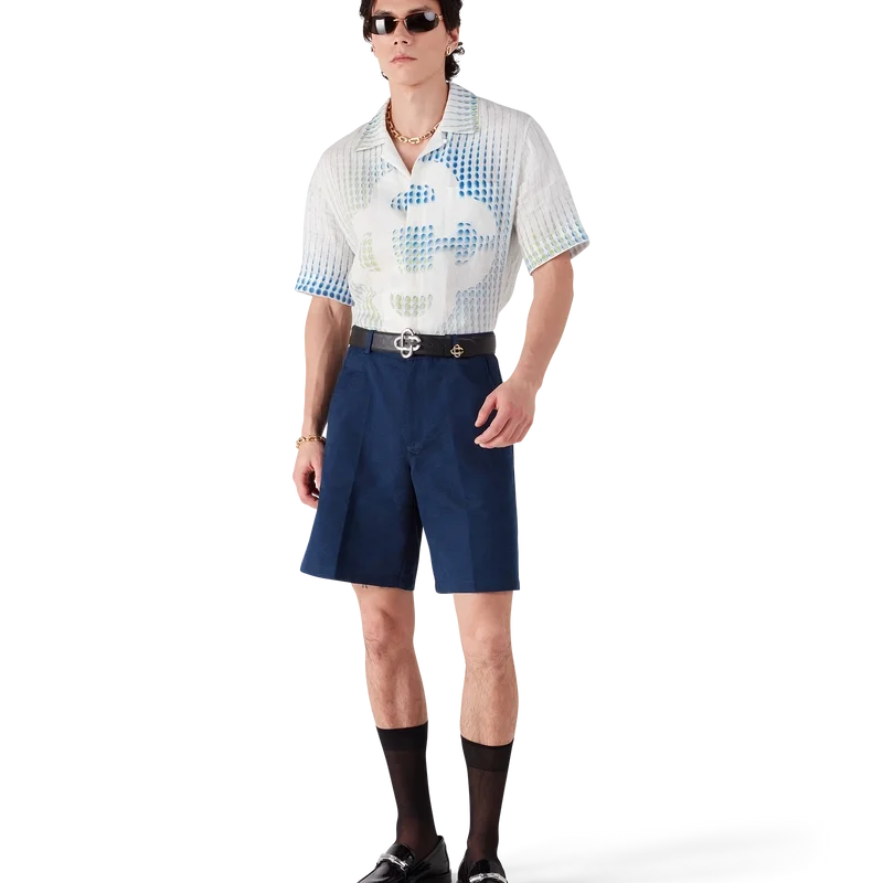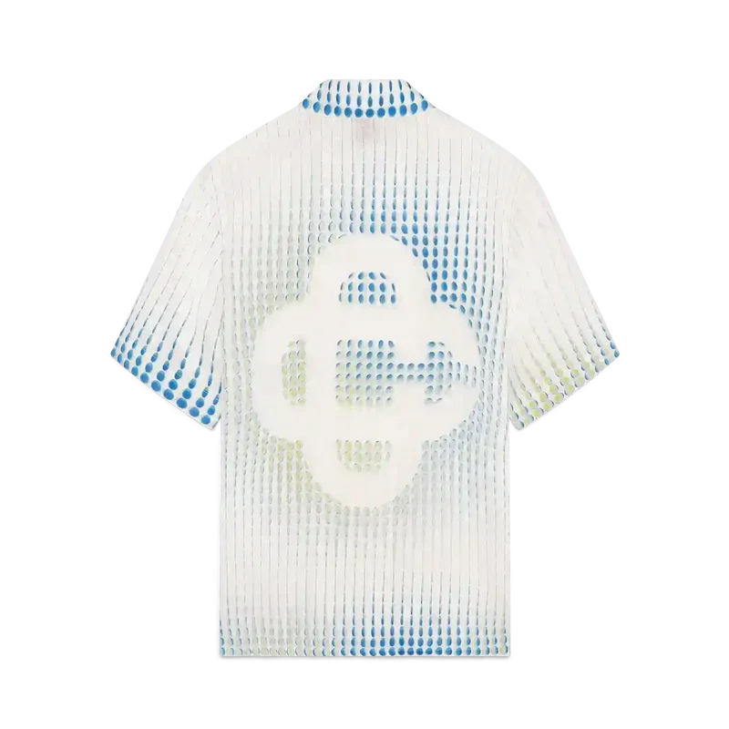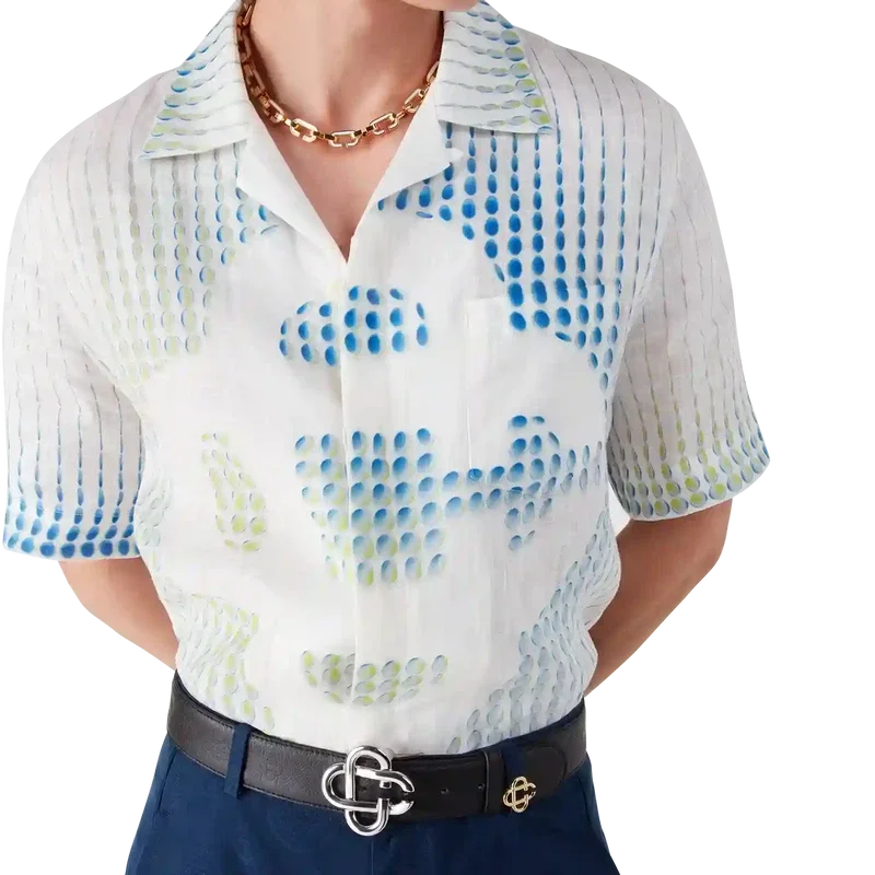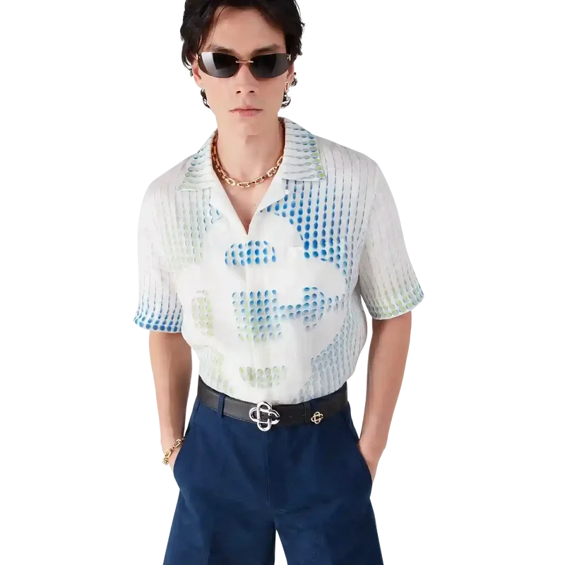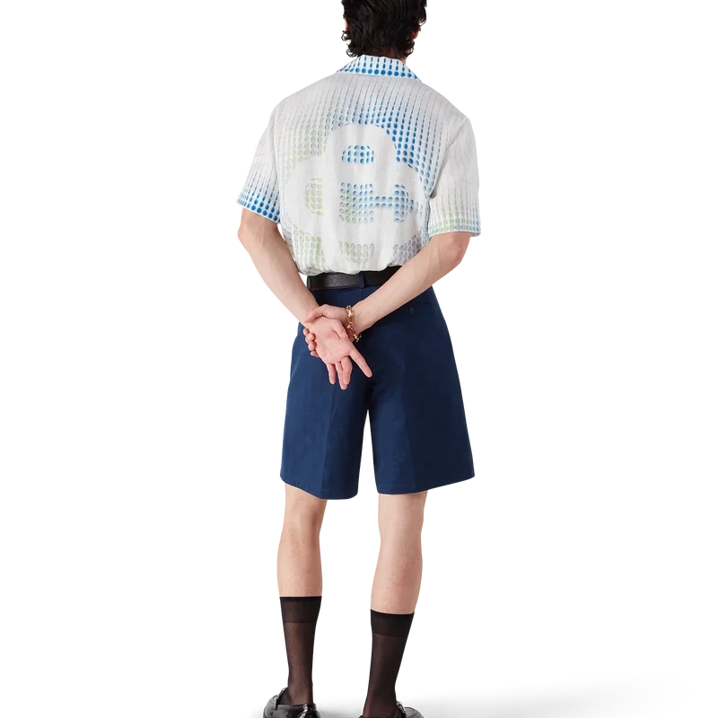 Dots-skjorten med korte ermer har et raffinert design med kunstverk som er et resultat av husets samarbeid med Martin Naumann. Naumann, som er kjent for sitt arbeid med fargeoverganger og tekstureffekter, har gitt husets logo et nytt uttrykk gjennom et eksperimentelt perspektiv, og skapt et samspill mellom halvtoner og glasslignende gjennomsiktighet. Fullført med kubansk krage, knappelukking og sammenflettede Cc-logo-knapper i corozo.