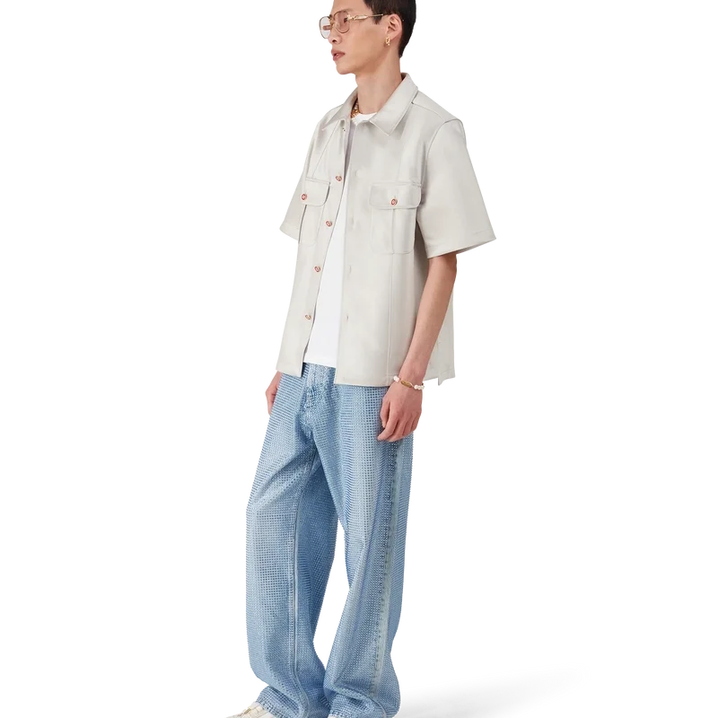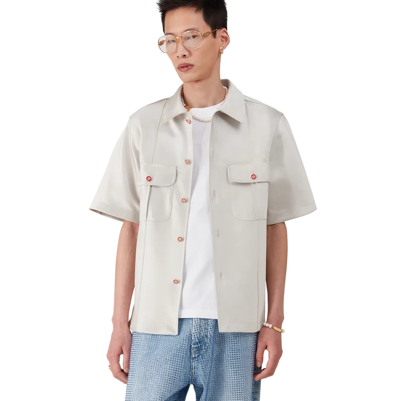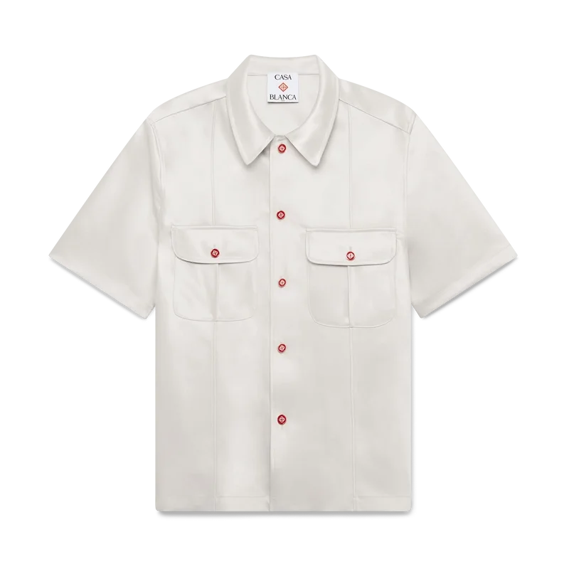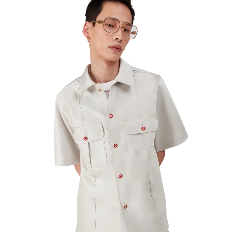 Duchesse-satinskjorten er en kortærmet modell laget av duchesse-satinstoff. Den har knappelukking, røde Cc-knapper med flat skaft i emalje, spiss krage, pin-tuck-søm foran og bak, 2 cm sideslisser og påsydde brystlommer med klaff og knappelukking.
