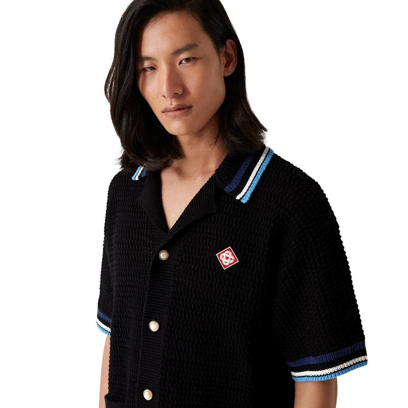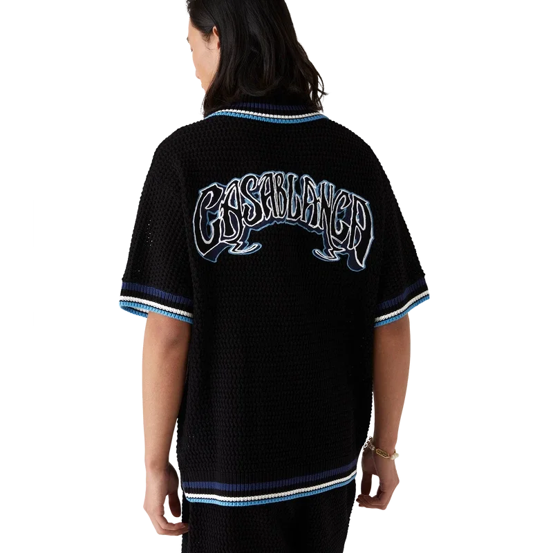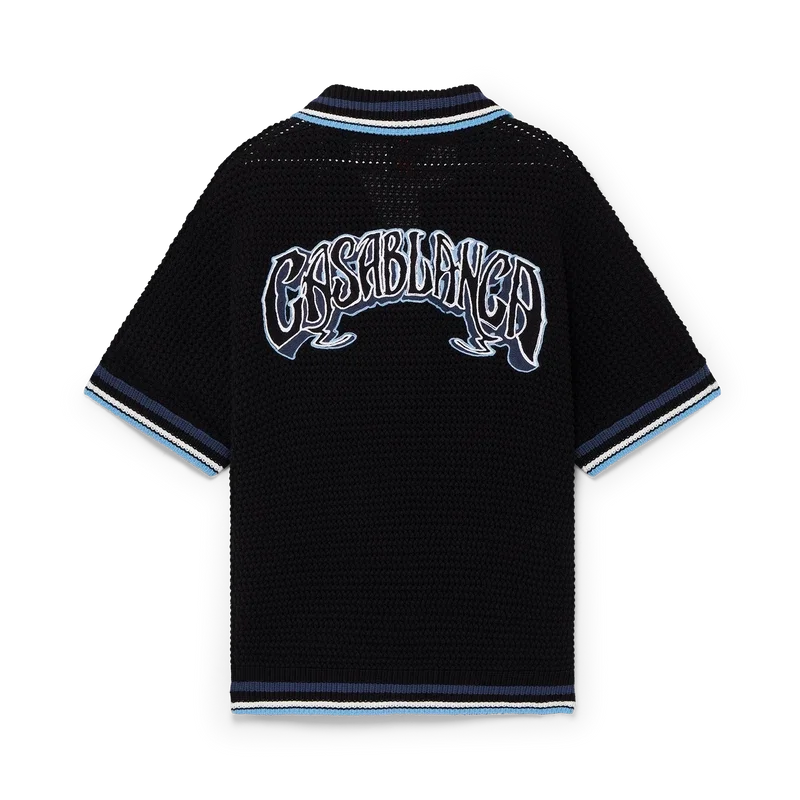 Den gotiske heklede skjorten er en kortærmet strikket modell laget av heklet bomullsstoff og har husets karakteristiske diamantlogo. Fullført med karakteristiske gullkantede perleknapper, påsydde lommer foran, håndtegnet typografi av Casablanca-logoen inspirert av den gotiske skrifttypen som brukes i tatoveringer, og stripete kantdetaljer på kragen, mansjettene og nederkanten.