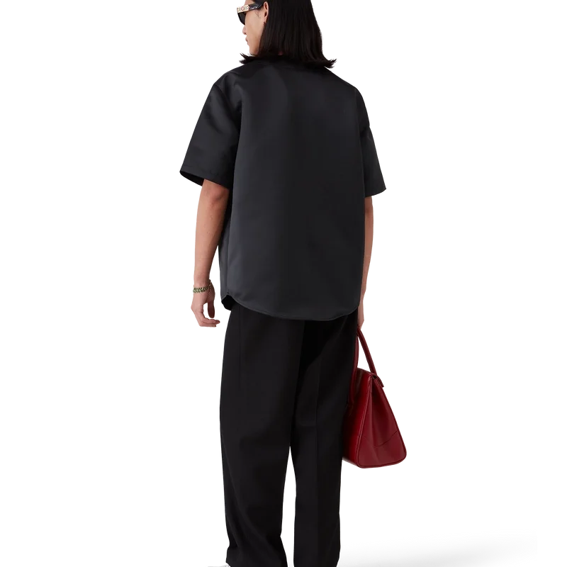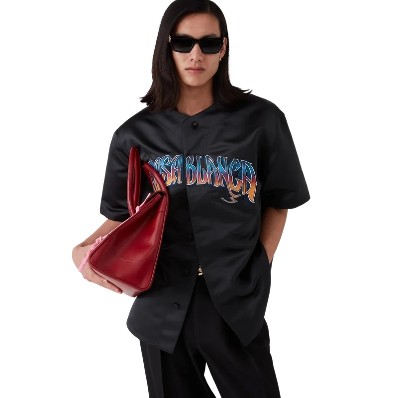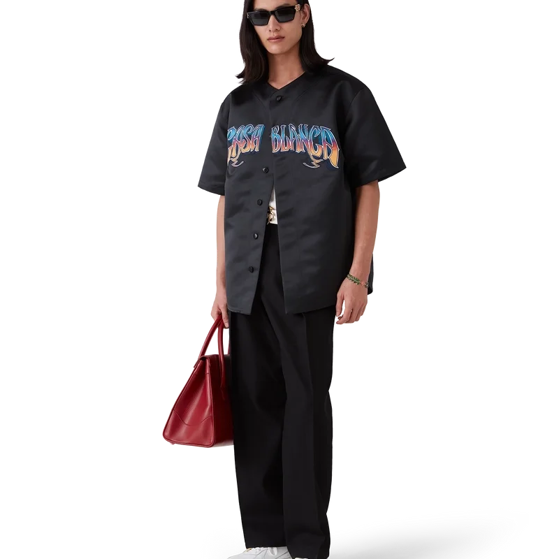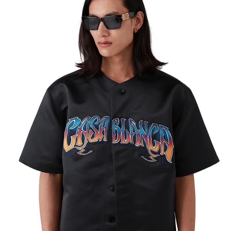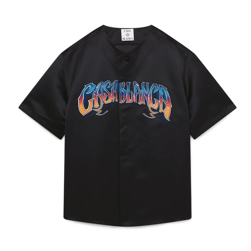 Den gotiske baseballskjorten er en kortærmet modell laget av satengstoff og har husets Casablanca-logo. Den er utstyrt med knappelukking, sammenflettede Cc-logo-knapper i corozo og håndtegnet typografi av Casablanca-logoen i sesongens fargegradient, inspirert av den gotiske skrifttypen som brukes i tatoveringer.