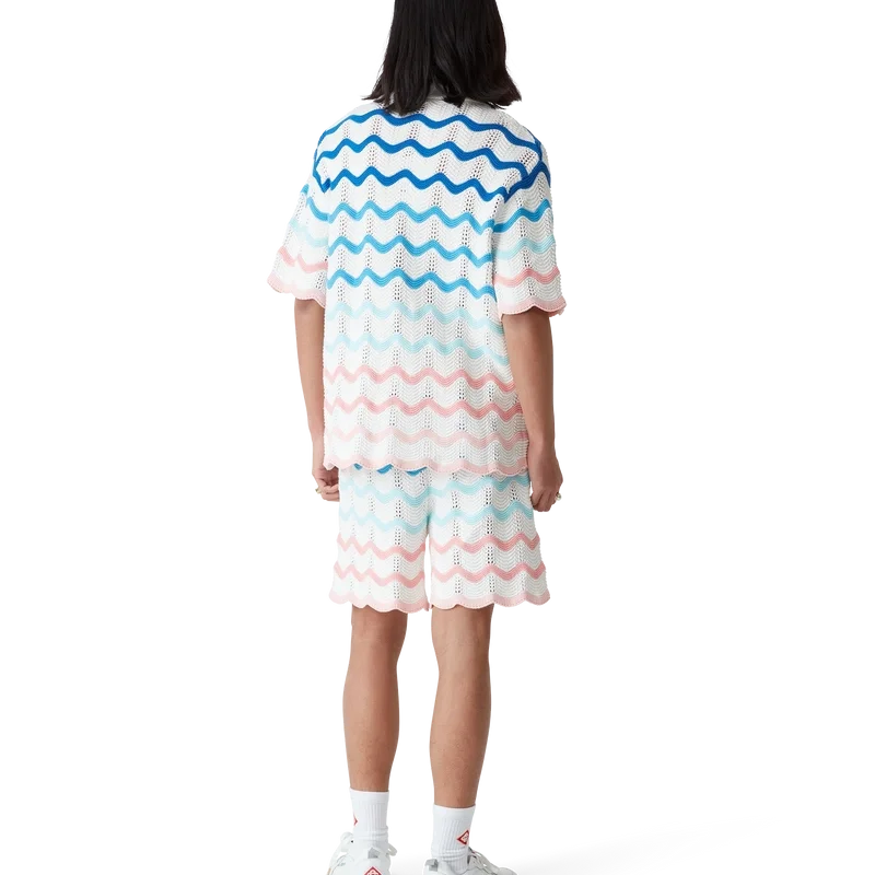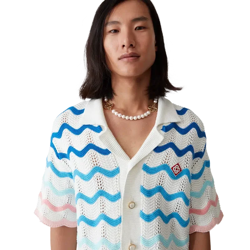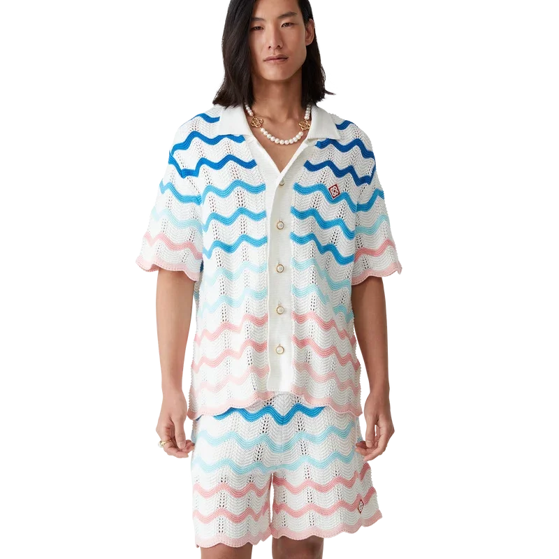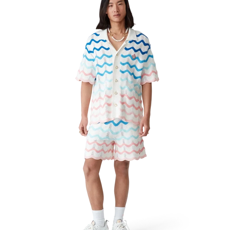 Gradient Wave Crochet Skjorte er en kortermet skjorte laget av heklet bomullsstoff og har et designelement inspirert av Memphis-bølgen. Den har knappelukking, husets diamantlogo, kubansk krage, signaturperleknapper med gullkant og bølgemønster på kantene.