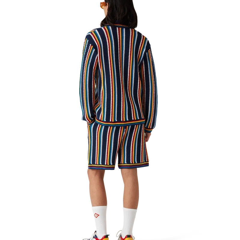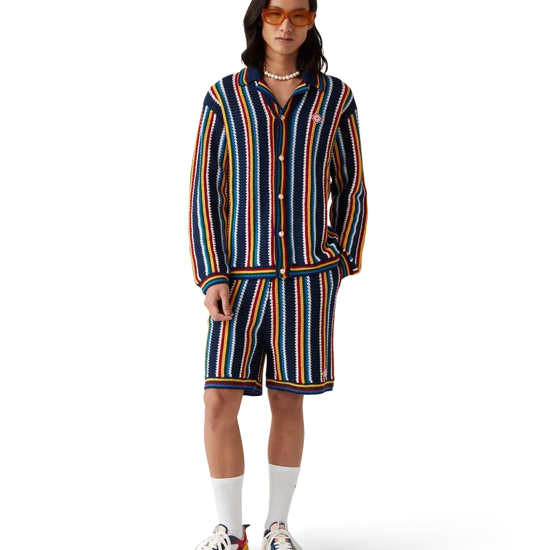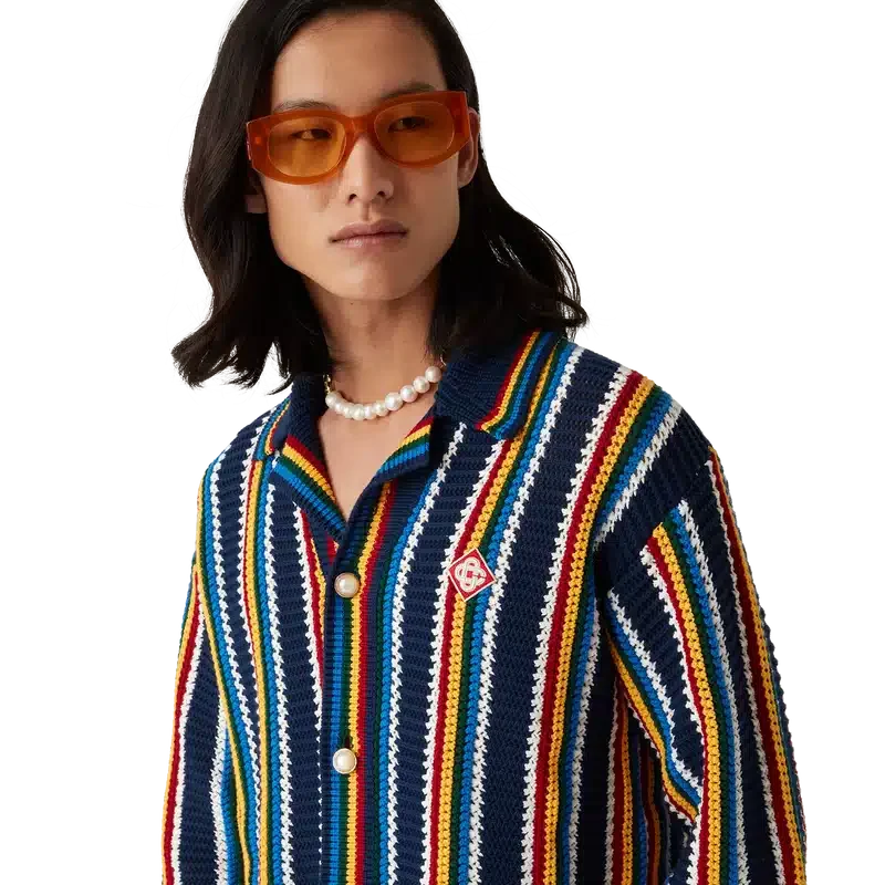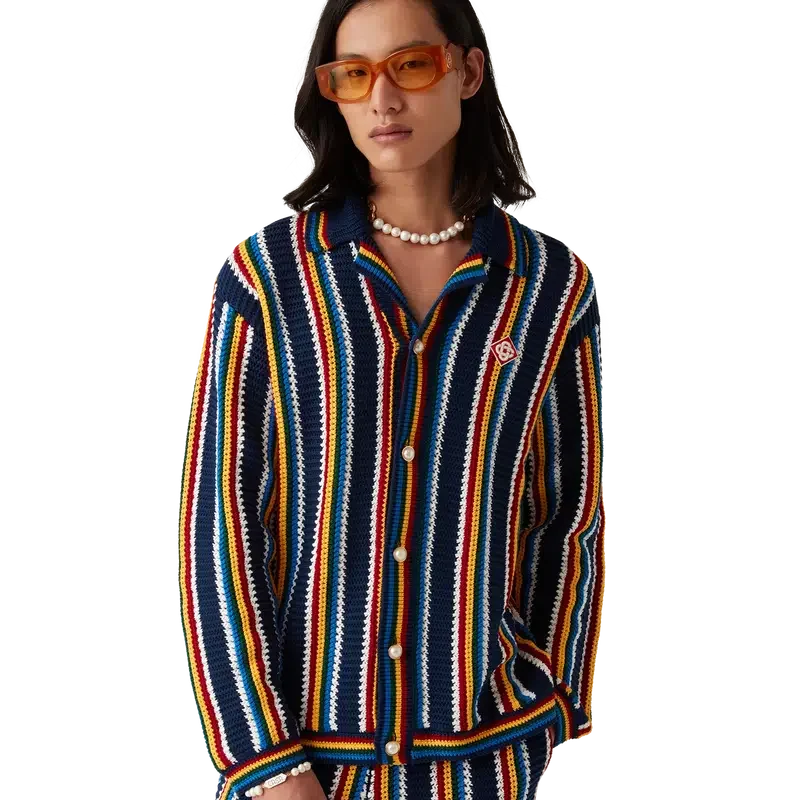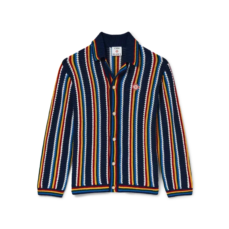 Den heklede stripete skjorten er en stripete langermet skjorte med strukturert design, laget av et heklet bomullsstoff og med husets karakteristiske diamantlogo. Fullført med ribbestrikket krage, mansjetter, nederkant og knappeliste, karakteristiske gullkantede perleknapper og knappelukking foran.