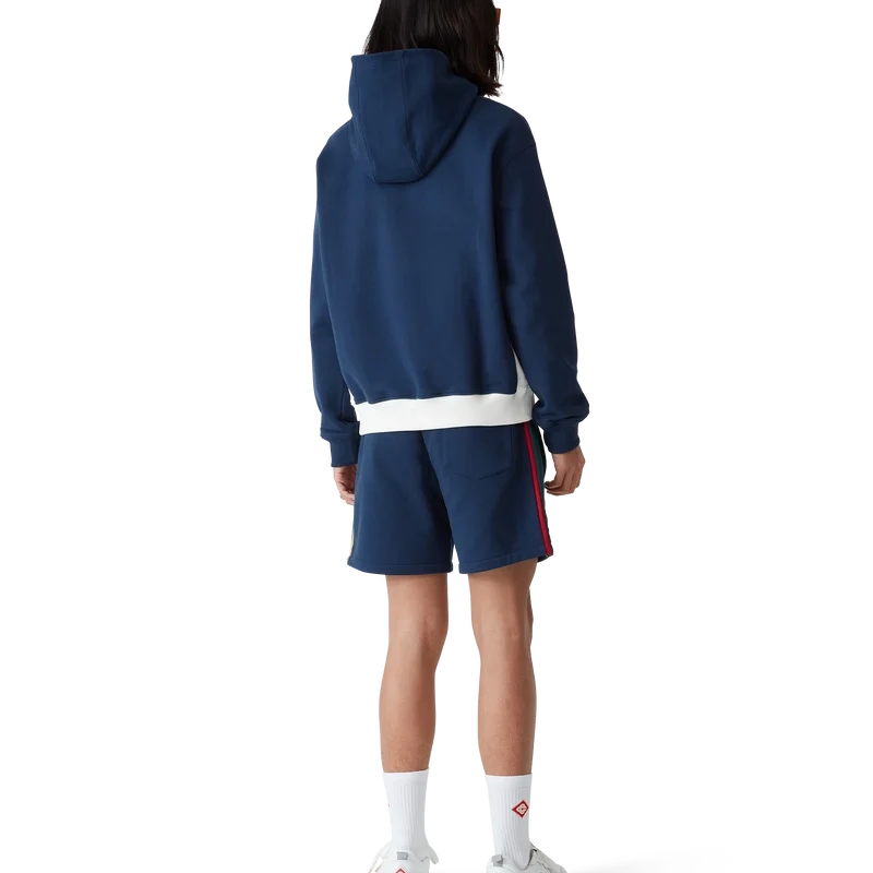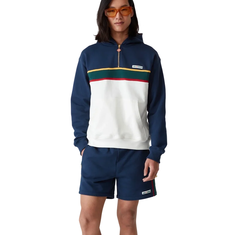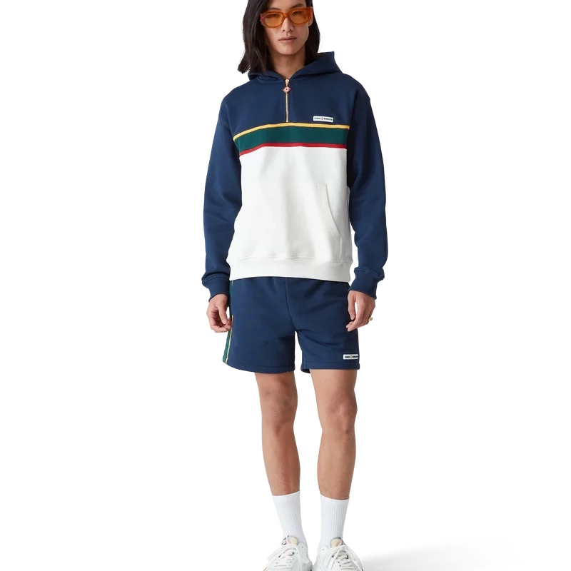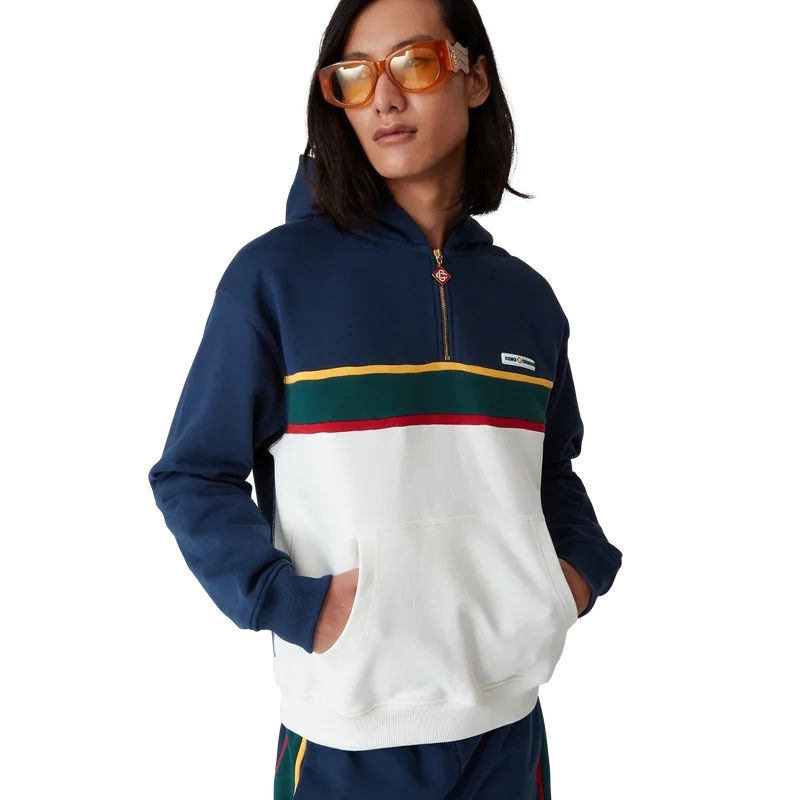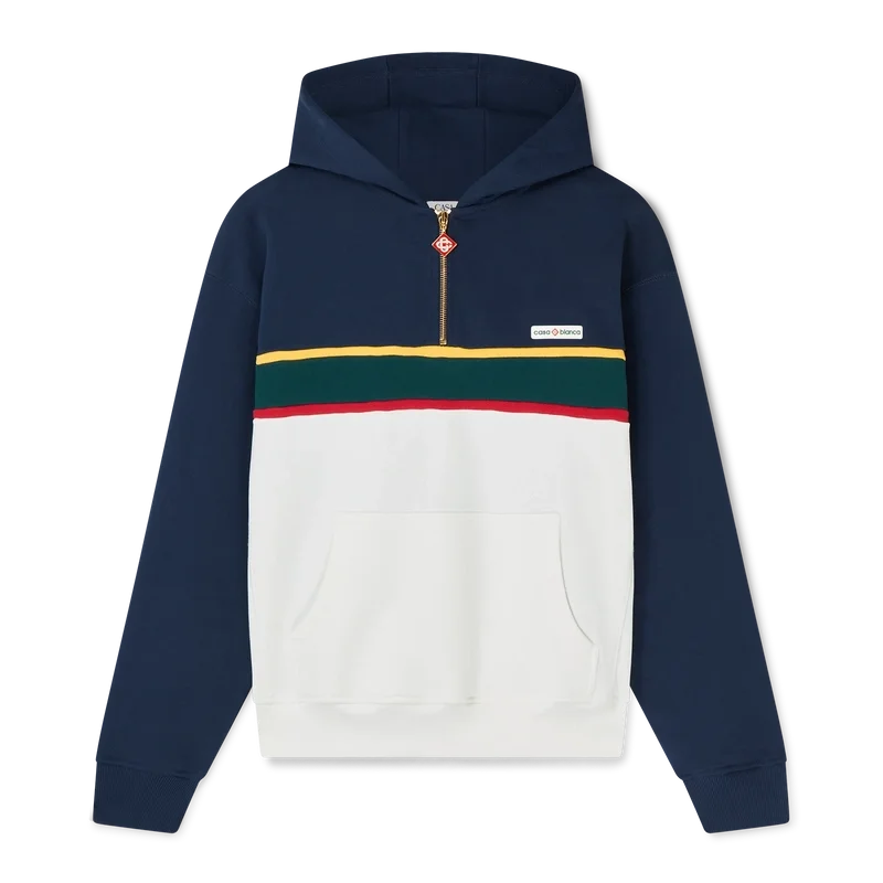 Hettegenseren med fargede blokker og kvart glidelås er et langermet sportstøydesign laget av økologisk bomullsloopback-stoff. Den har hette, snøring med gullspisser for sikker lukking, kontrastpaneler, kengurulomme foran og ribbede mansjetter og nederkant.