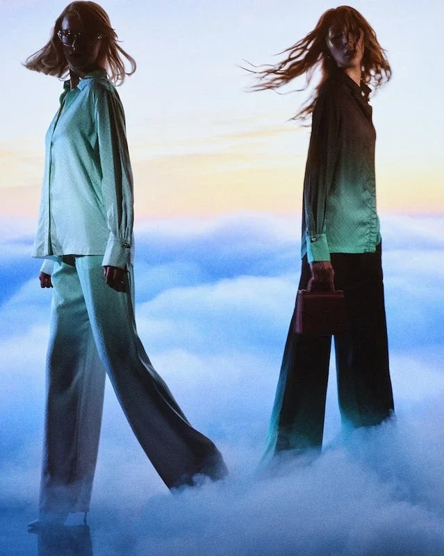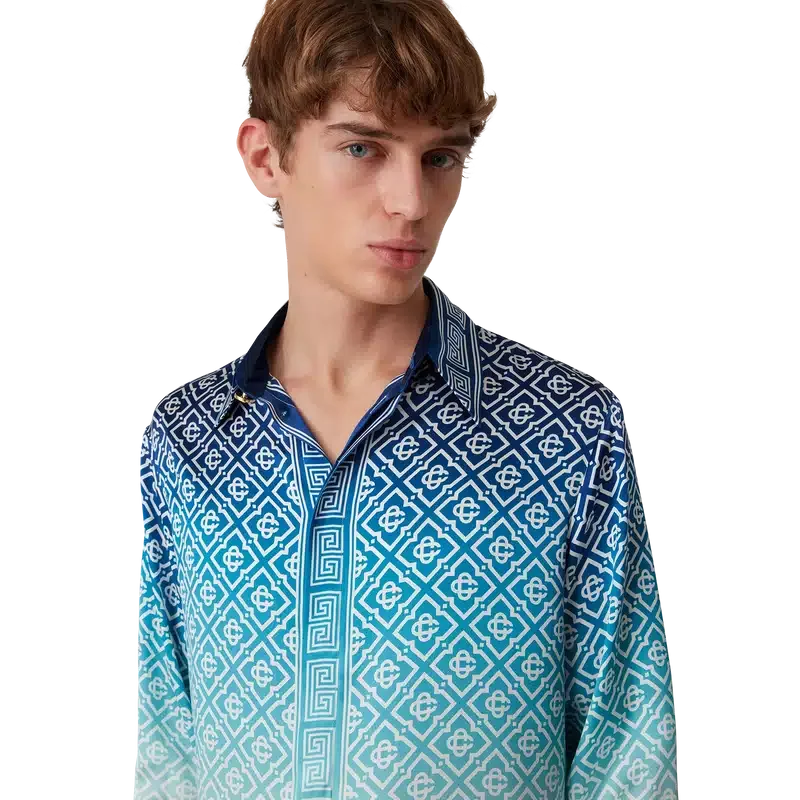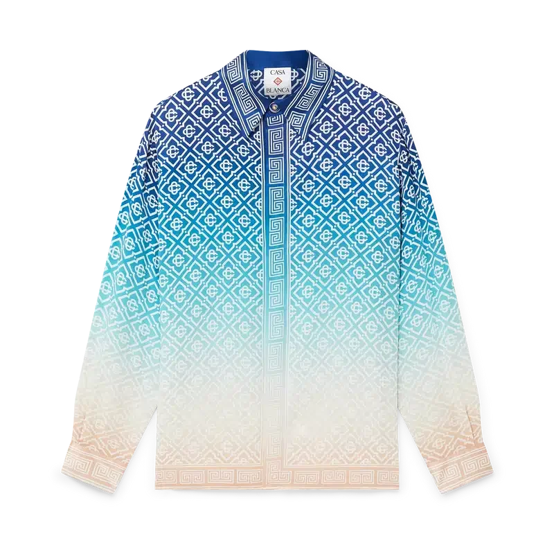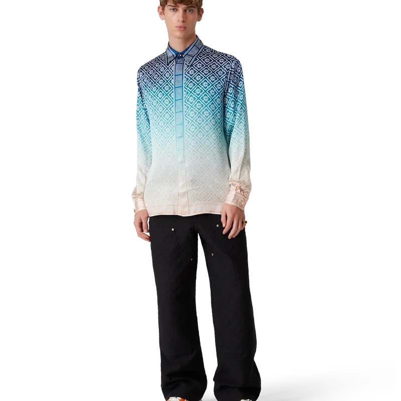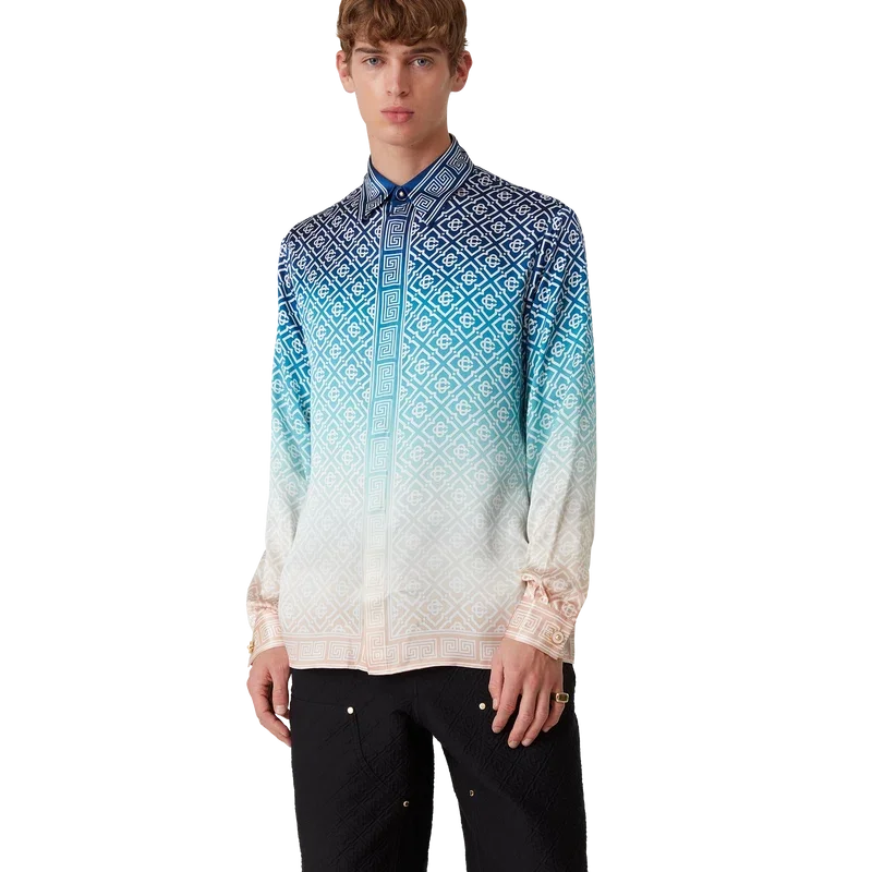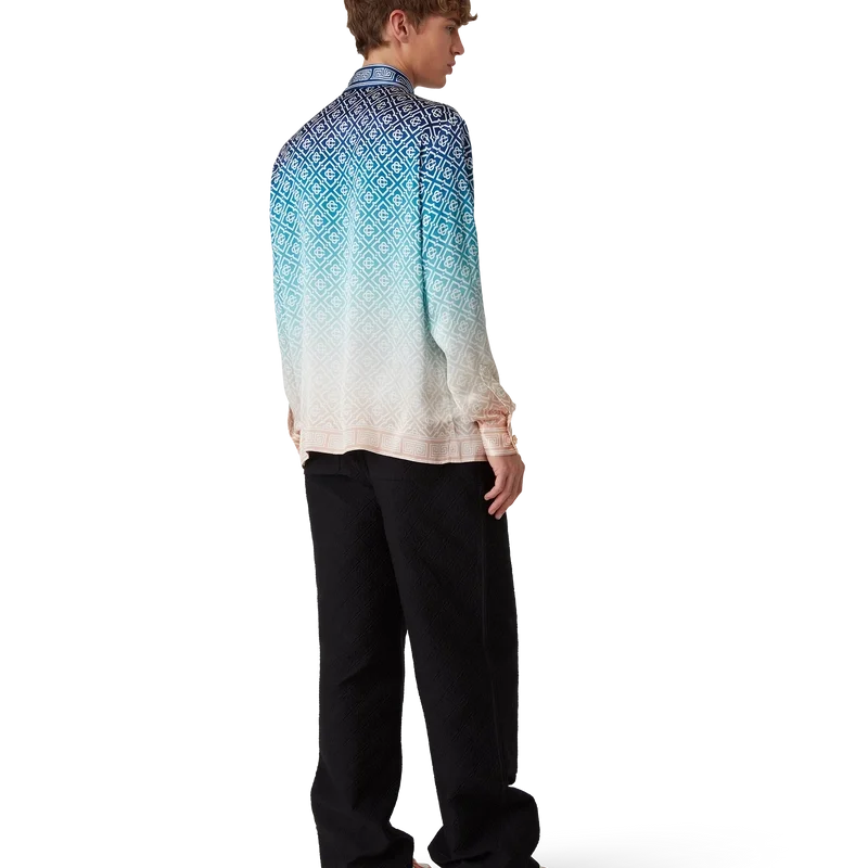 Jacquard-silkeskjorten med gradient er en langermet skjorte med heltrykk, laget av et silkesatin-stoff med gradient-monogram. Den har krage, emaljeknapper med gullkant på ermene og kragen, knappestolpe foran med sammenkoblede Cc-merkede corozo-knapper, samt gresk-inspirerte kantdetaljer på krage, mansjetter, knappestolpe og nederkant.