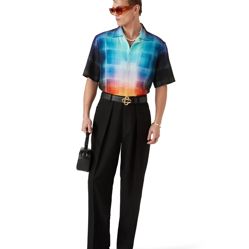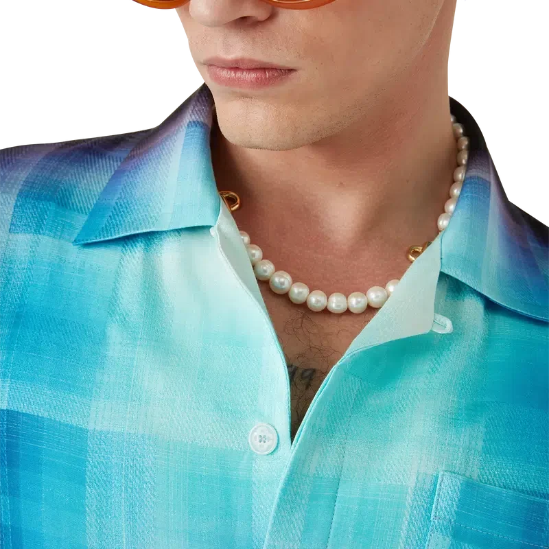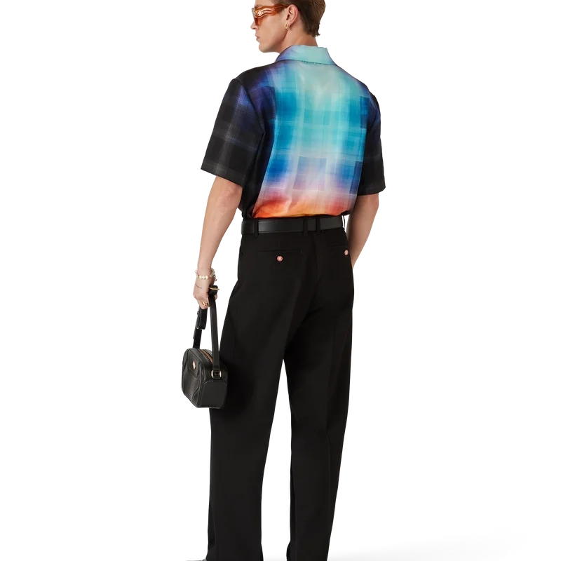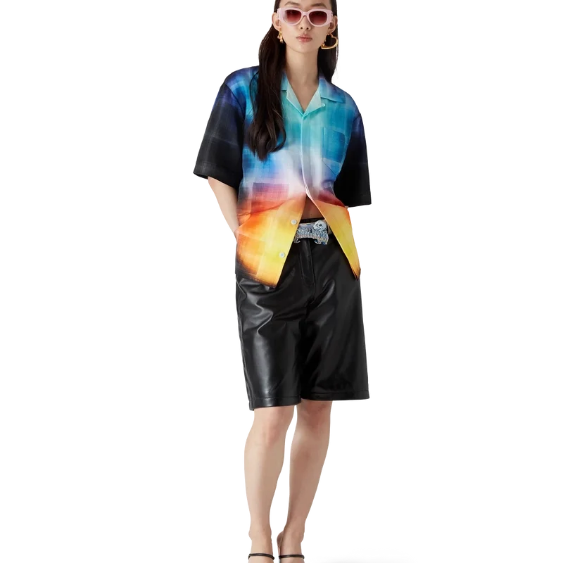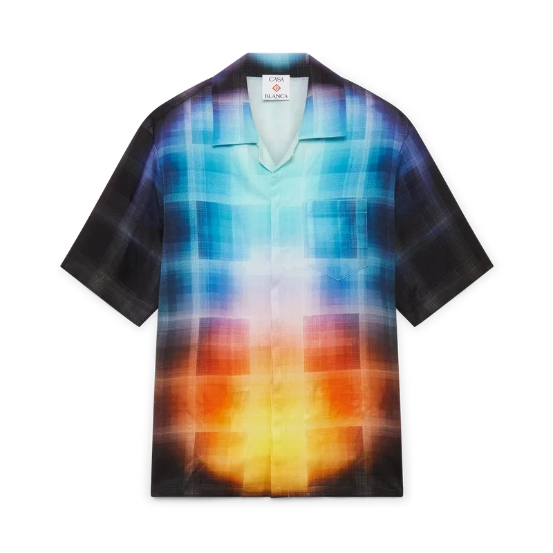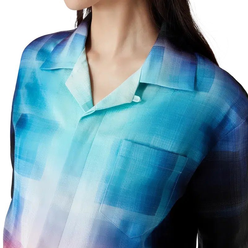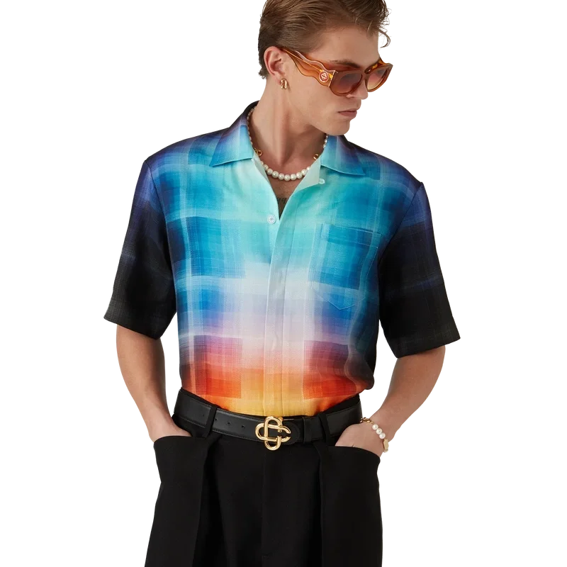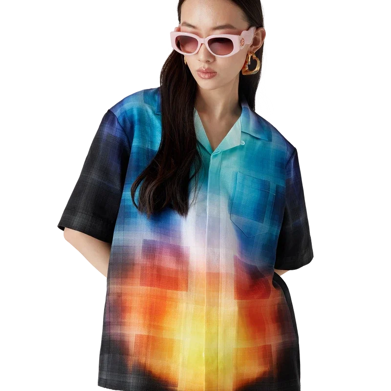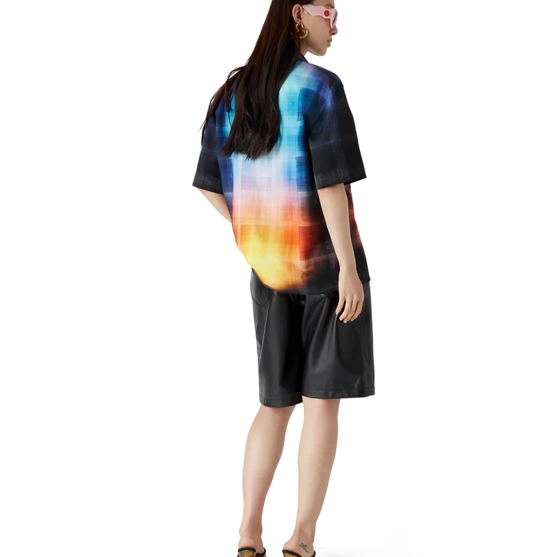 Gradient Check-skjorten har et trykt design med sesongens gradientfarger, laget av en bomullsblanding med rutemønster. Den har kubansk krage, brystlomme, skjult knappelukking og Corozo-knapper med sammenflettet CC-logo.