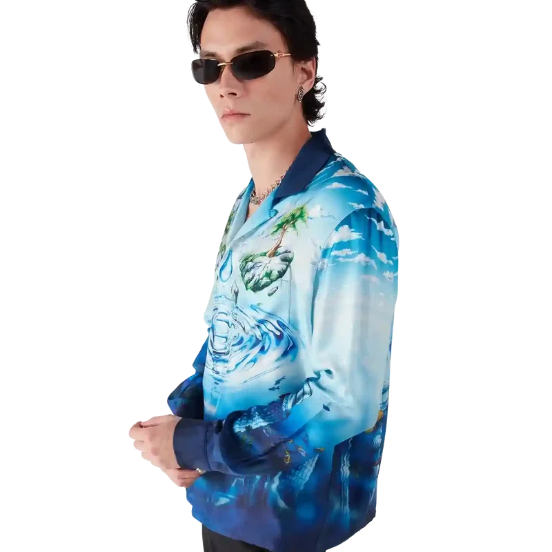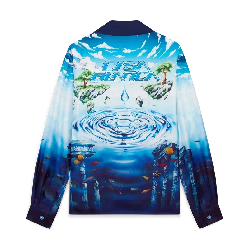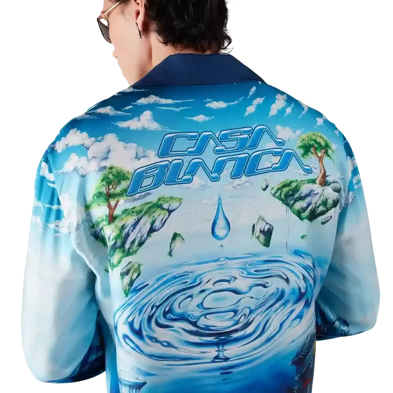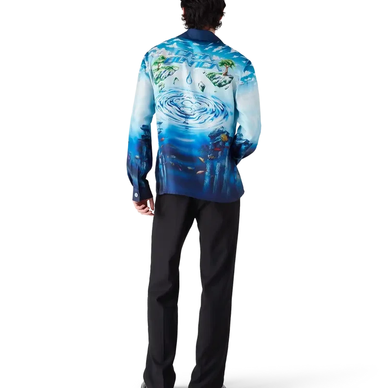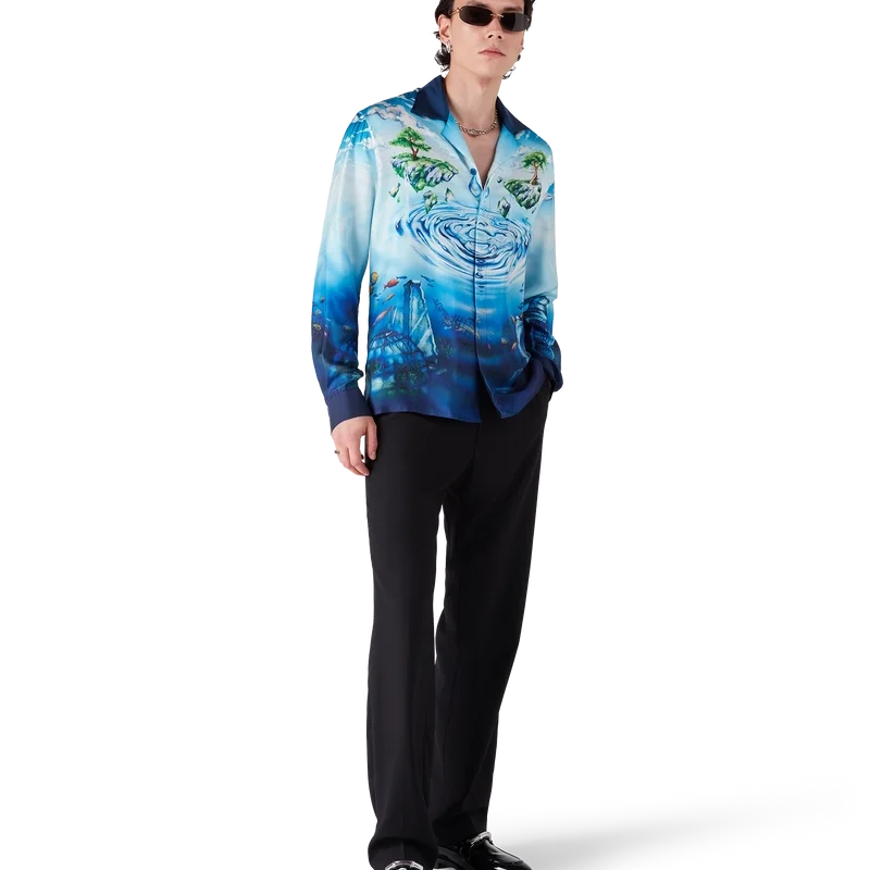 Lost Atlantis langermet skjorte har et raffinert design med husets Water Atlantis-kunsttrykk som blander digitalt og håndmalt kunstverk. Det sammenflettede CC-logoet er gjengitt som krusninger i vann, mens den nedre delen av skjorten refererer til den mytiske sivilisasjonen Atlantis, beriket med eksotisk dyreliv og skjulte skatter. Fullført med knappelukking, knapper med det sammenflettede CC-logoen og signaturknapper med gullkant og emalje på mansjettene.