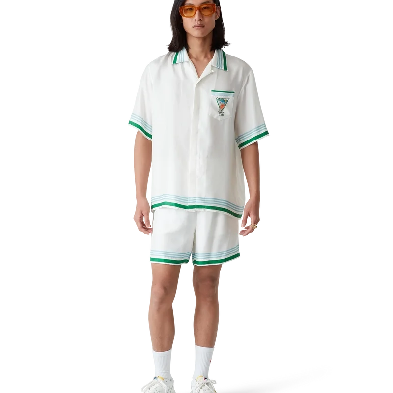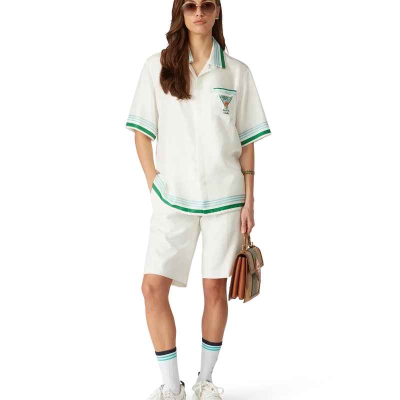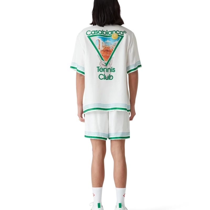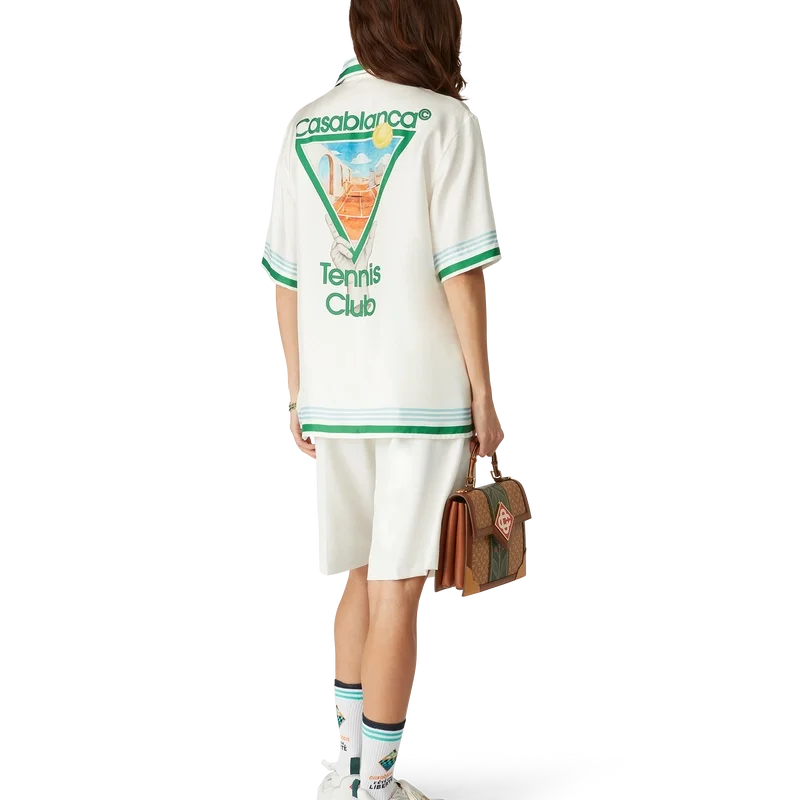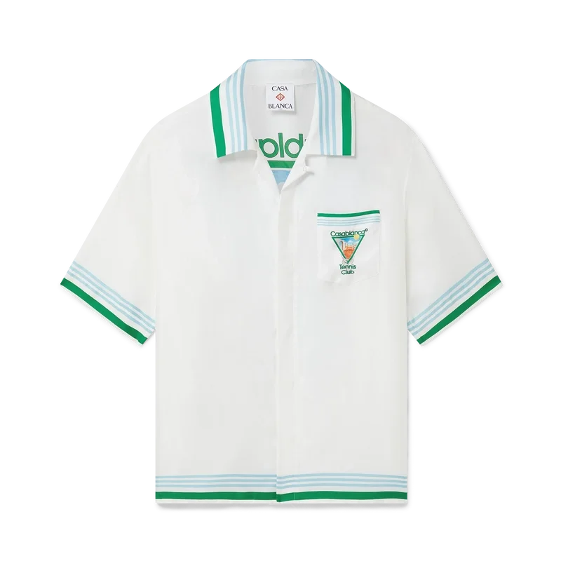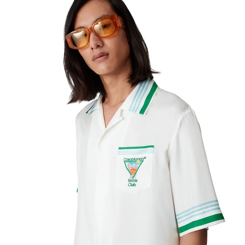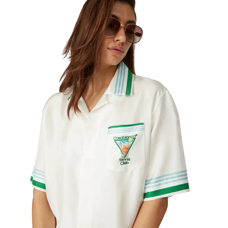 Metaphysical Tennis Icon silke-skjorte er en kortærmet modell laget av silketwill med husets sesongbaserte kunstverk, inspirert av den kontinuerlige studien av den klassiske skjønnheten og den moderne sjarmen i det antikke Hellas, og innlemmer husets designelementer fra tennis, natur og arkitektur. Fullført med signaturknapper i corozo med sammenflettet CC-logo, skjult knappelukking, kubansk krage, brystlomme og detaljer i blå, hvite og grønne striper på mansjetter, krage og nederkant.