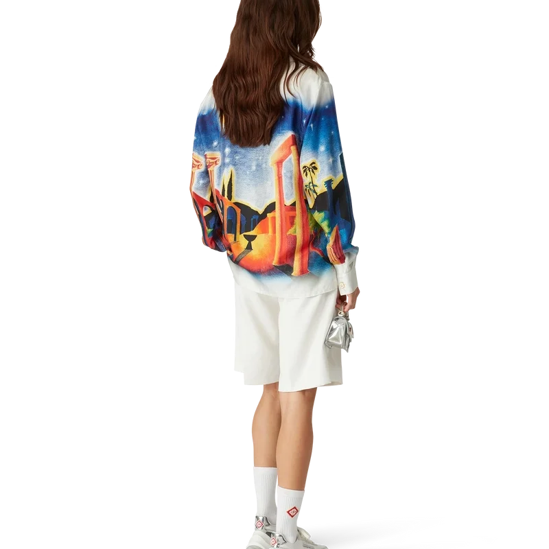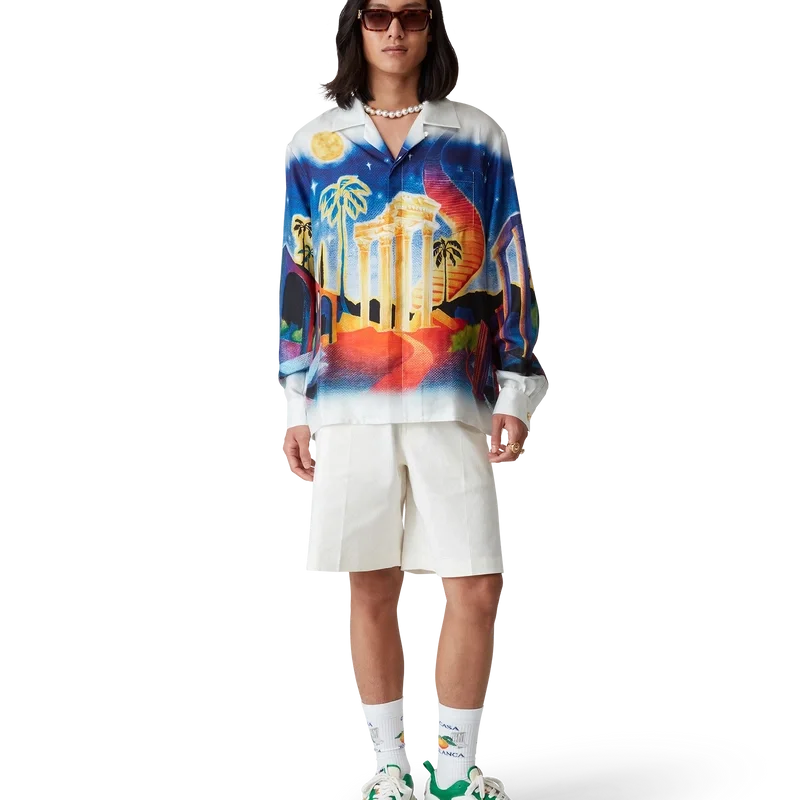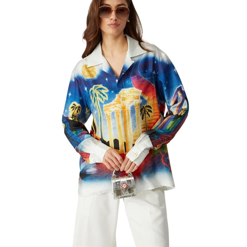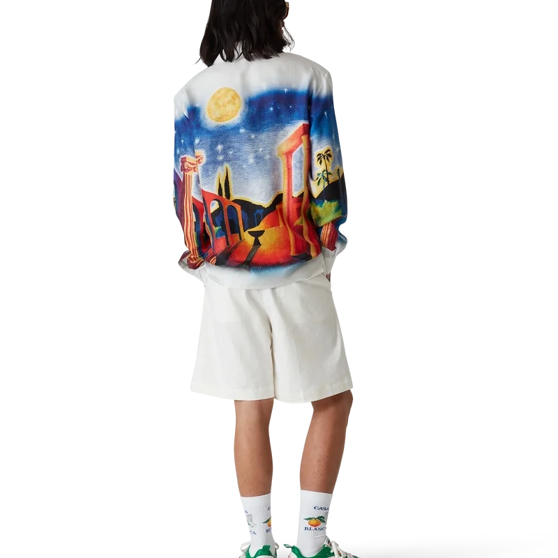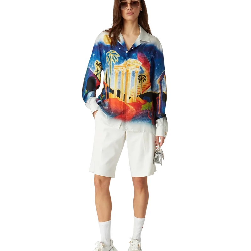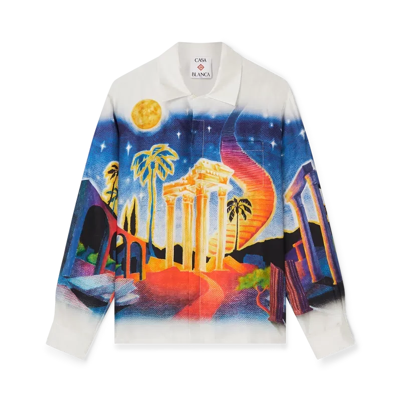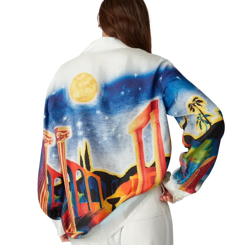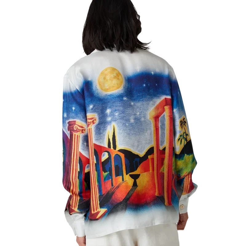 Midnight Acropolis silke-skjorte med lange ermer har et heltrykt design laget av silketwill-stoff som hyller den vakre natten i det antikke Hellas med lyset fra tempelet og himmelen. Fullført med kubansk krage, emaljeknapper med gullkant på ermene og knappelukking foran med sammenflettede Cc-merkede corozo-knapper.