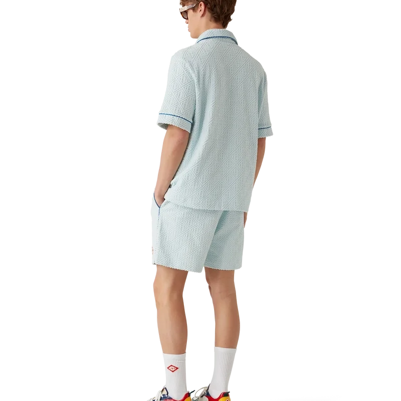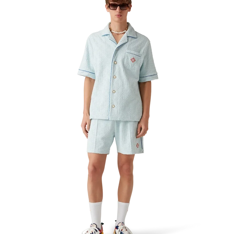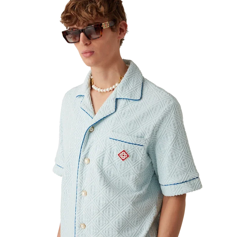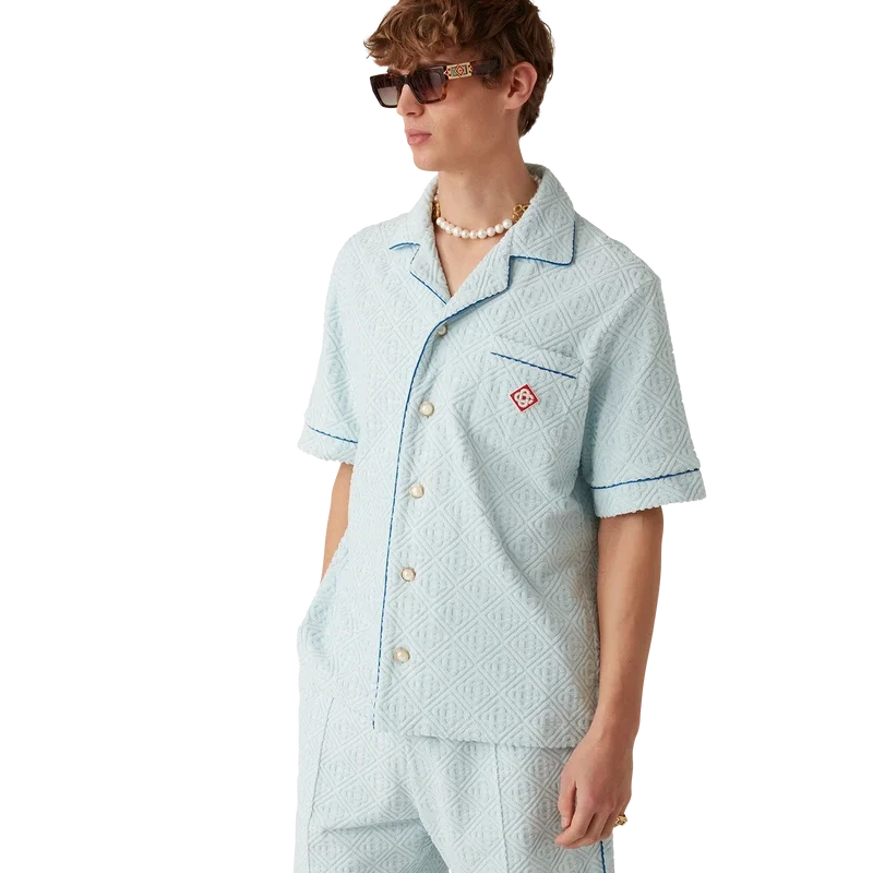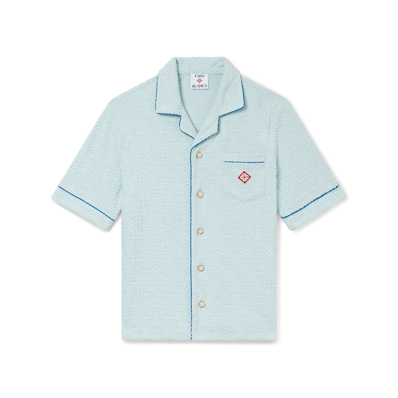Monogram-frottéskjorten er en kortærmet modell laget av et Monogram-frottéstoff i bomullsblanding og har husets karakteristiske diamantlogo. Den har brystlomme, kontrastpiping, gullkantede perleknapper og kubansk krage.