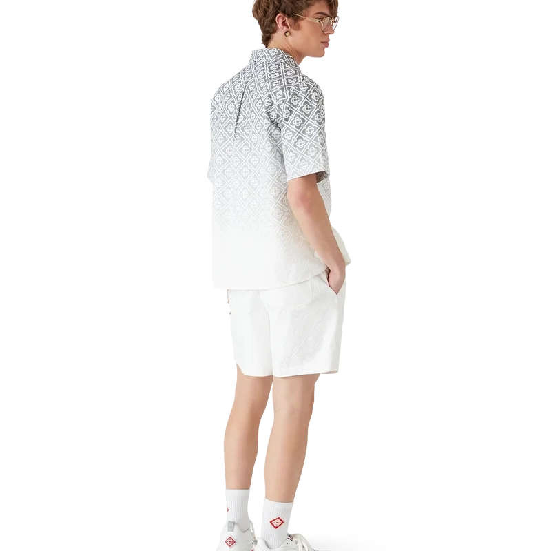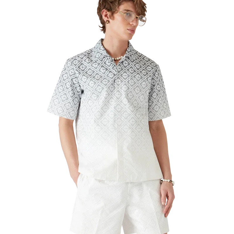Monogram Gradient-skjorten er en kortærmet skjorte med trykk og en klassisk silhuett, laget av et bomullsblandingsstoff med Monogram Gradient-mønster og husets karakteristiske Diamond Monogram. Den har knappelukking, brystlomme og kubansk krage.