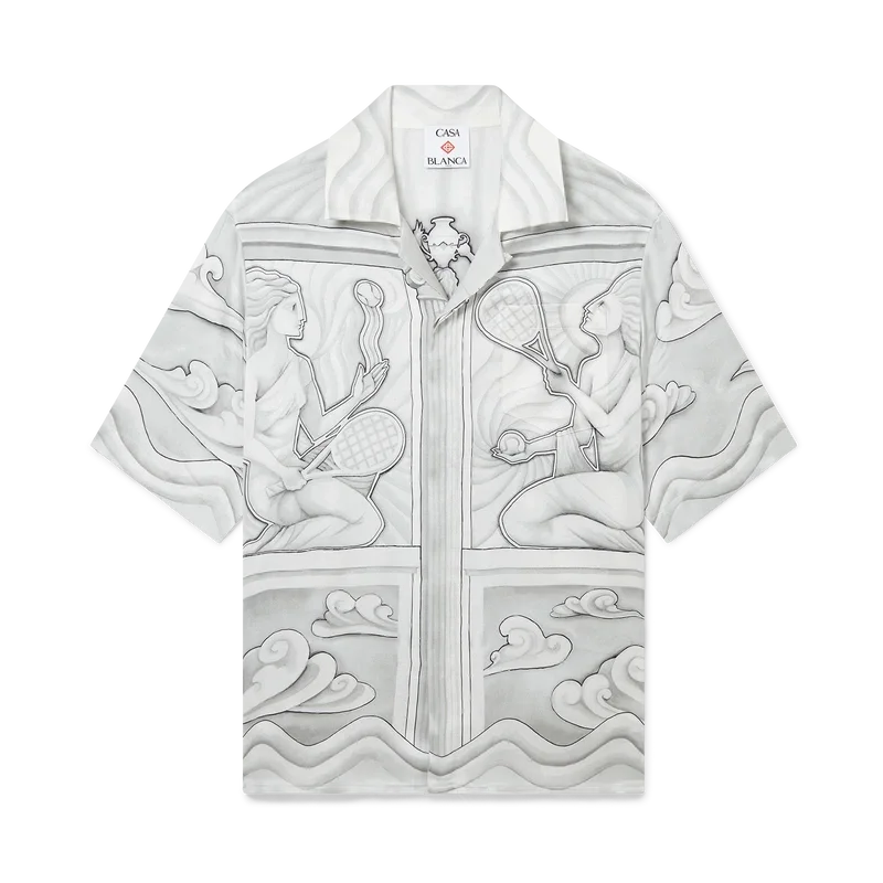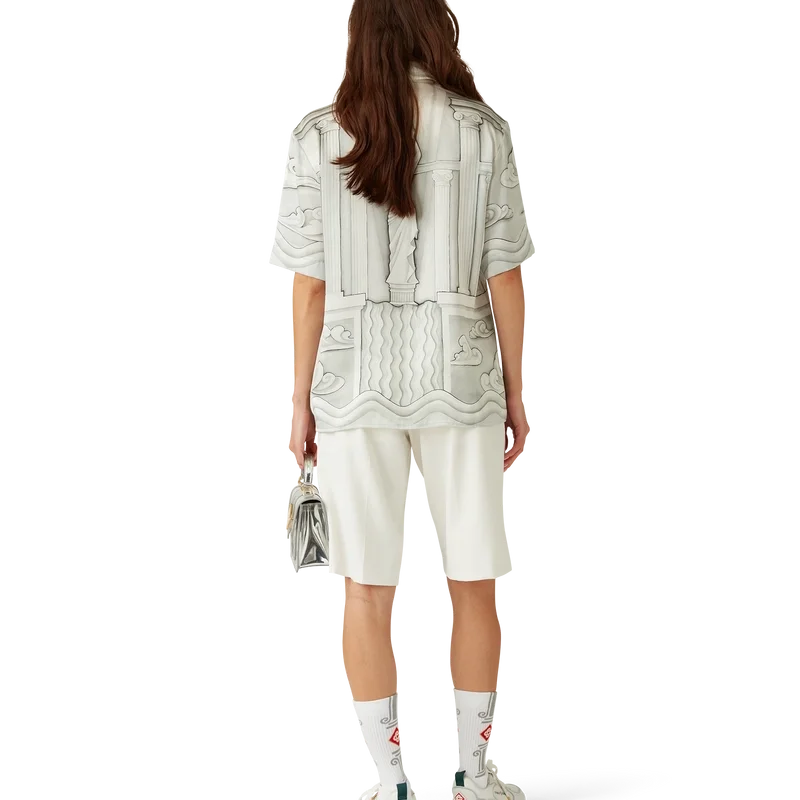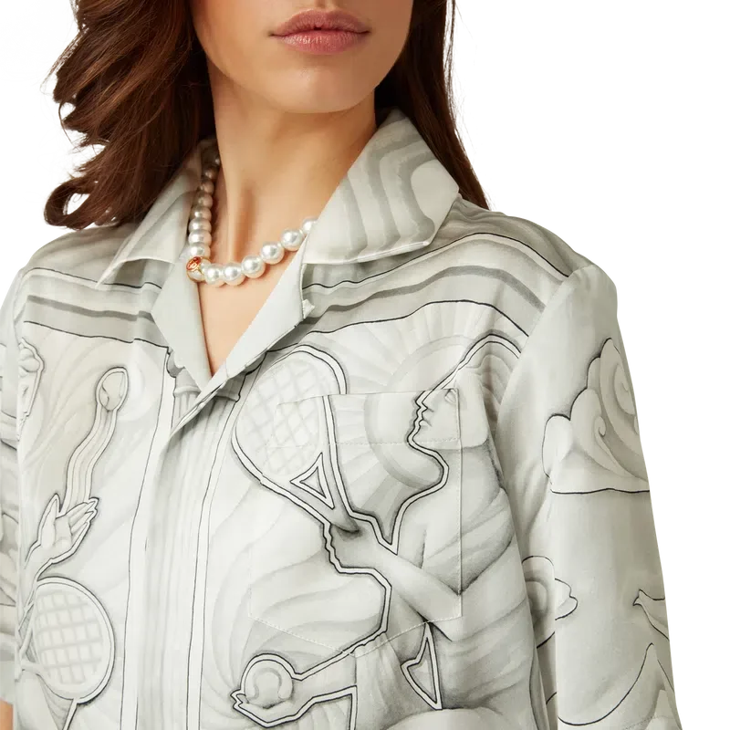 Sacred Stone silke-skjorte er en kortærmet skjorte med heltrykk, laget av silkesatin, med husets sesongbaserte kunstverk inspirert av trompe l’oeil-effekten med lette tegninger. Fullført med kubansk krage, knappelukking og sammenflettede CC-logo-knapper av corozo<!–