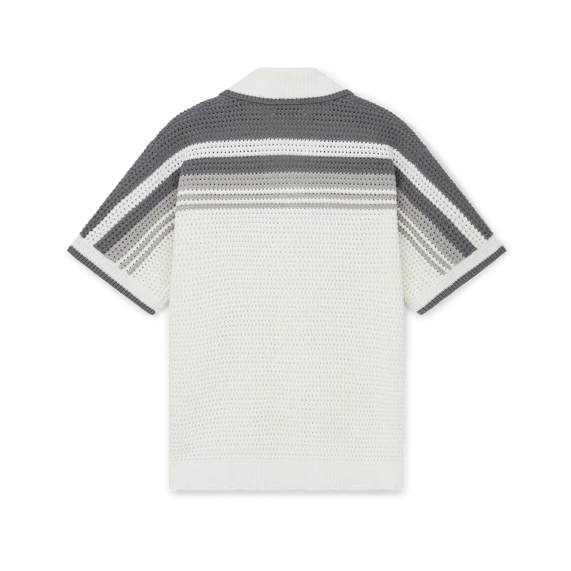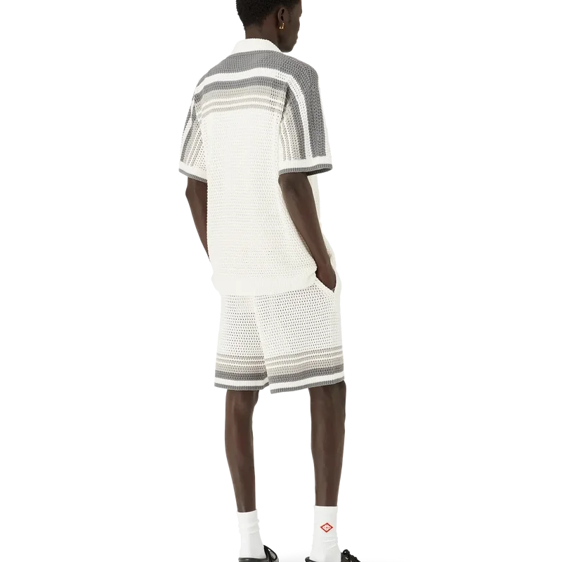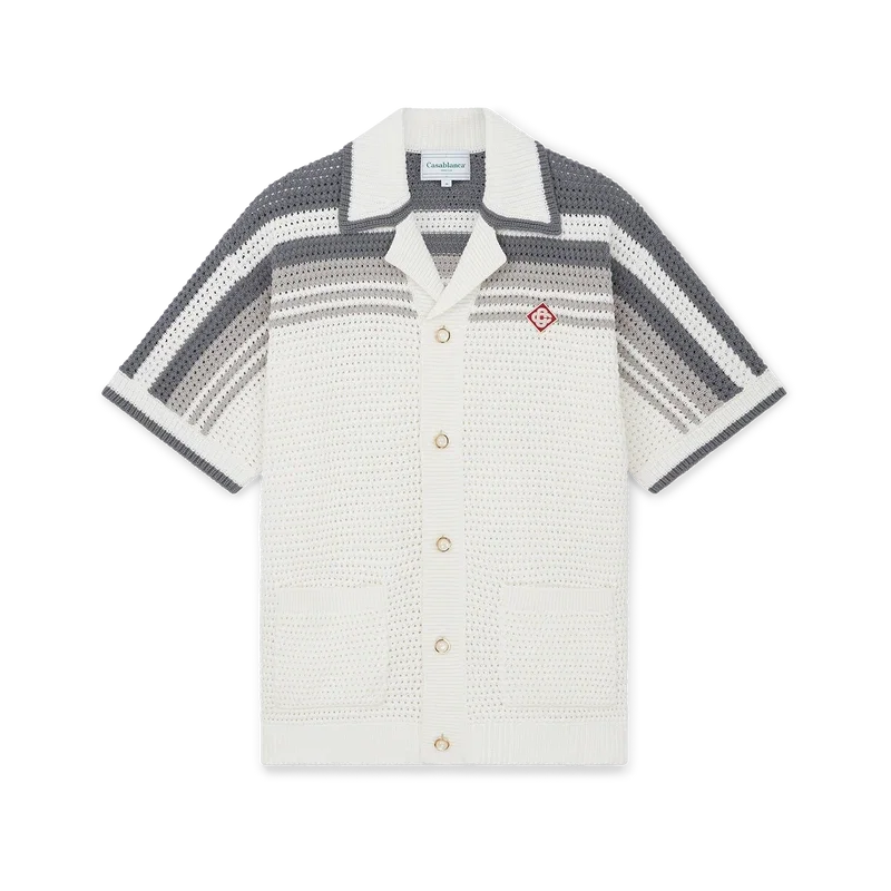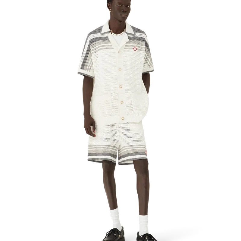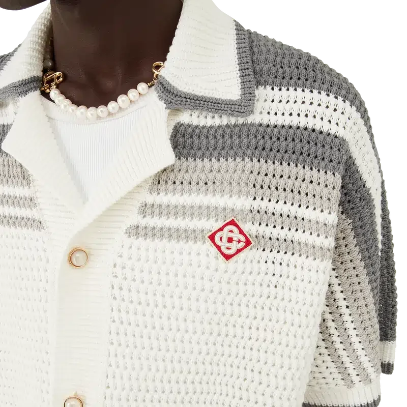 Tennis Crochet Shirt er en strikket skjorte laget av et heklet bomullsstoff med stripete detaljer på skuldrene, brystet og ermene. Den har ribbestrikket krage, mansjetter og nederkant med stripete detaljer, knappelukking foran, påsydde lommer foran og karakteristiske gullkantede perleknapper.