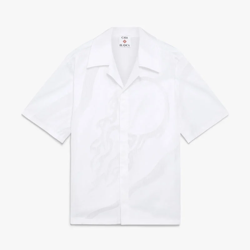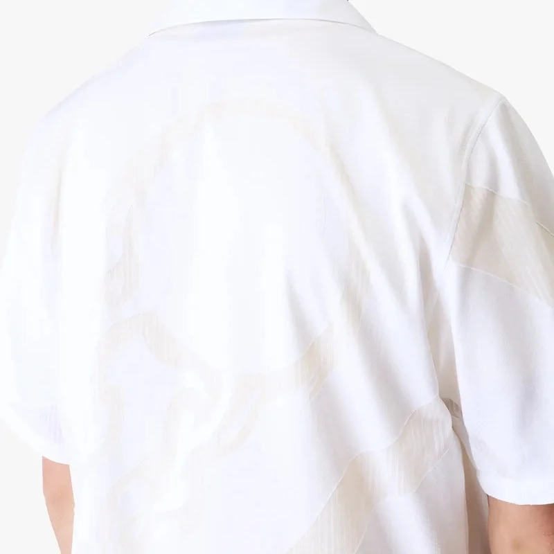 The Art of the Serve Fil Coupe kortærmet skjorte er et raffinert design laget av skjortestoff, med en grafisk tolkning av husets tennisball-logo i luften som representerer den grunnleggende balansen mellom kraft, hastighet og kontroll. Fullført med krage, knappelukking, sammenflettede Cc-logo-knapper i corozo og brystlomme.