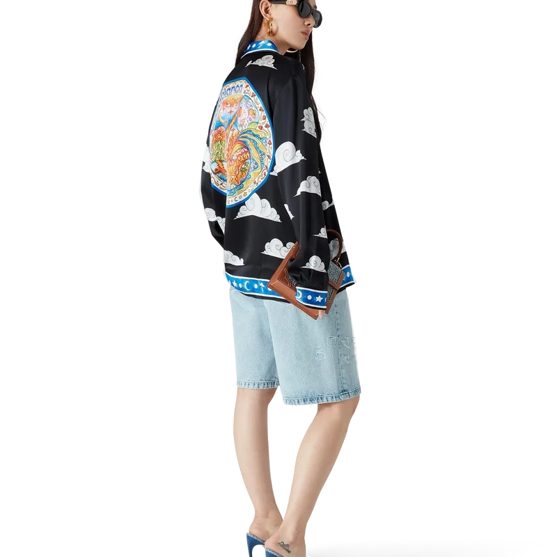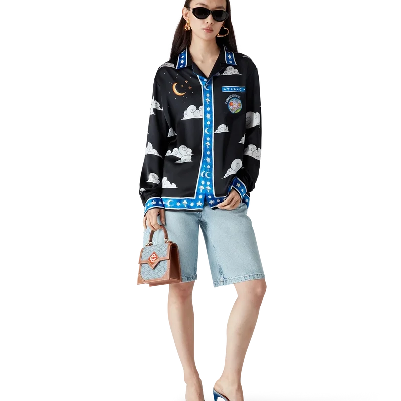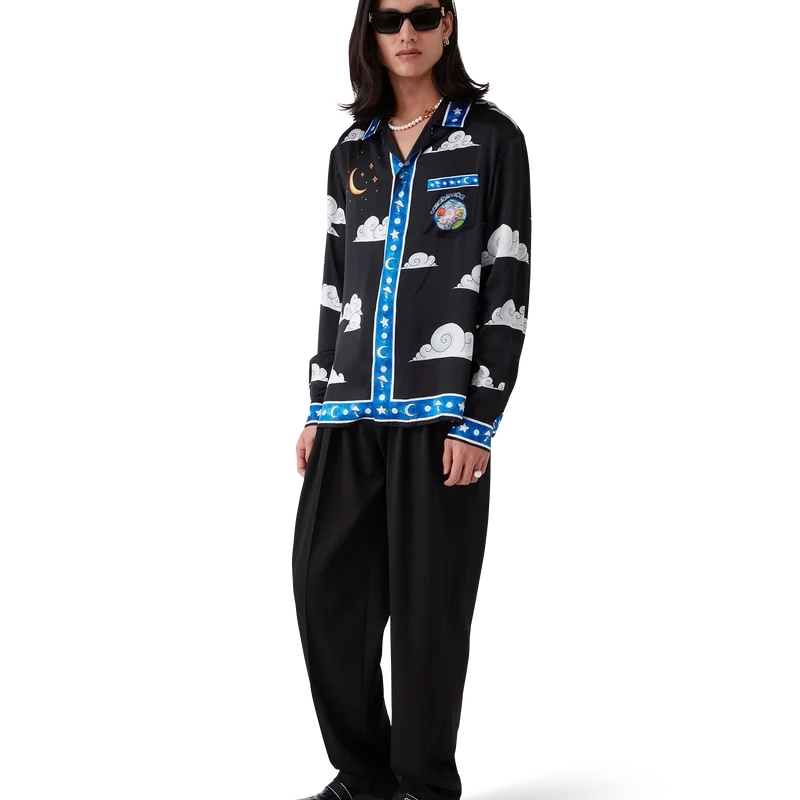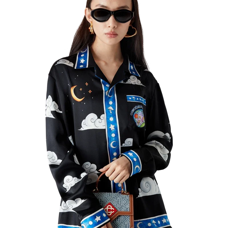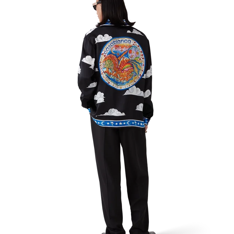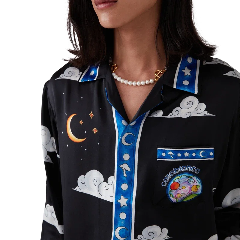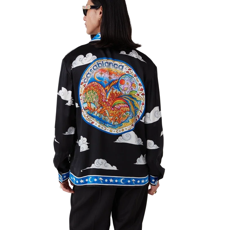 The Four Elements silke-skjorte er en langermet skjorte med heltrykk, laget av silkesatin med kunstverk som forener alle elementene i La: Skyline, strand, ild, vegetasjon og astronomi. Ferdig med kubansk krage, brystlomme, skjult knappelukking med sammenflettede Cc-logo-knapper i corozo, en emaljeknapp med gullkant på hver mansjett, og kantdetaljer på krage, mansjetter, knappelukking, nederkant og lomme.<!–