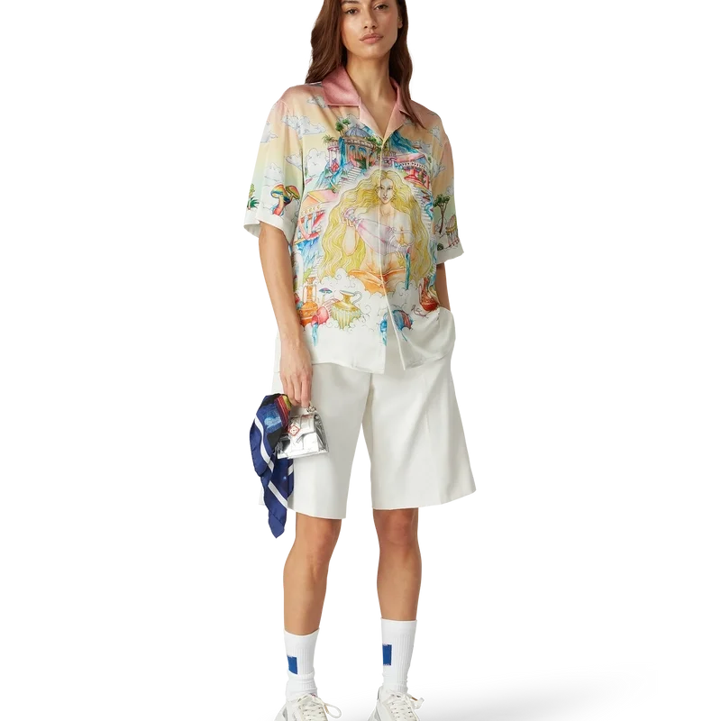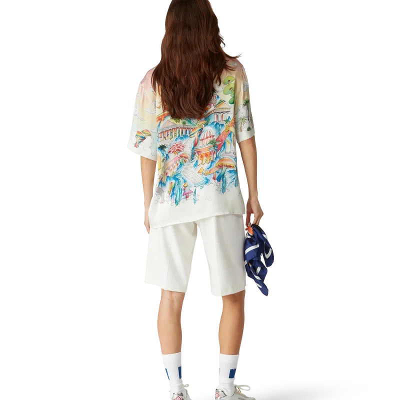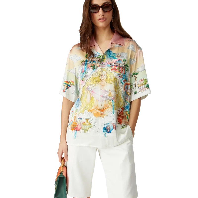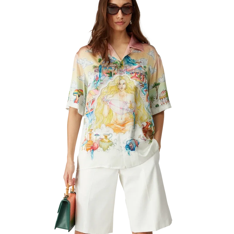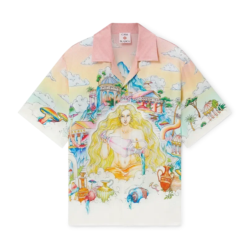 Silkeskjorten «The Road to Knowledge» er en kortærmet skjorte med heltrykk, laget av silkesatin med husets sesongbaserte kunstverk – en hyllest til myten om Eleusis, en praksis som fant sted i antikken – en samling som forente tenkere, arkitekter og kunstnere fra den tiden. De drakk en eliksir og utvidet sinnet – kunstverket skildrer et fjell fylt med sjekkpunkter. Fullført med kubansk krage, sammenkoblede Cc Corozo-knapper, knappelukking foran og brystlomme.