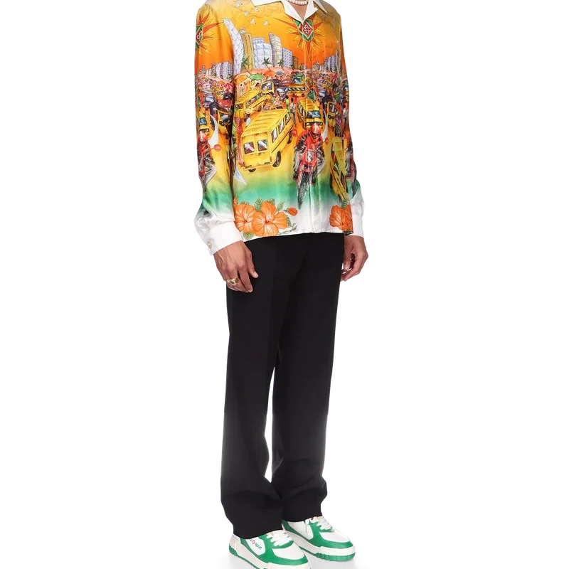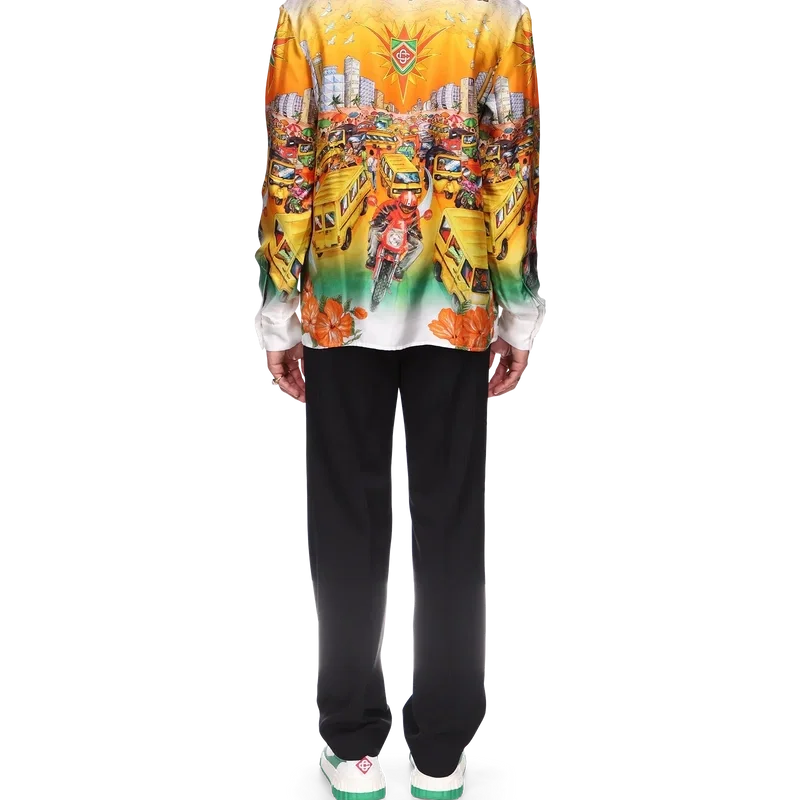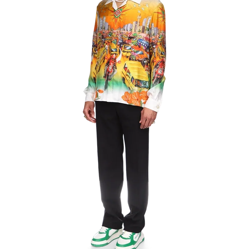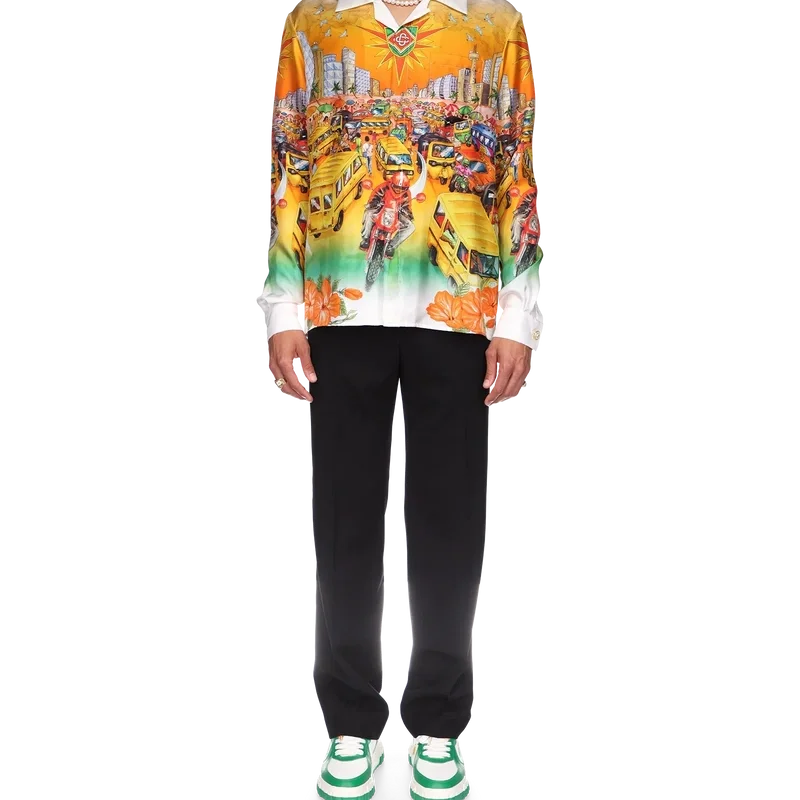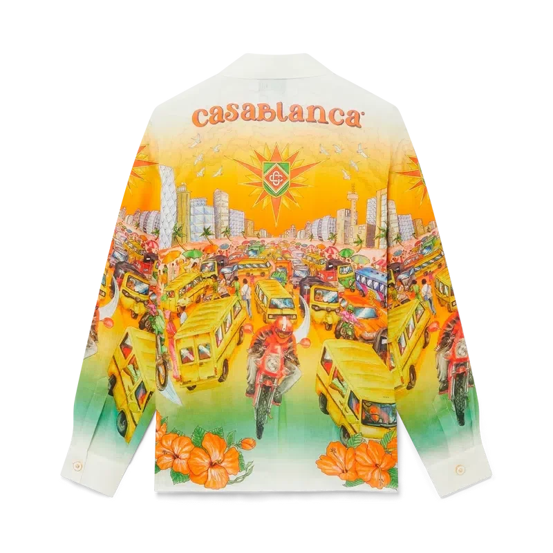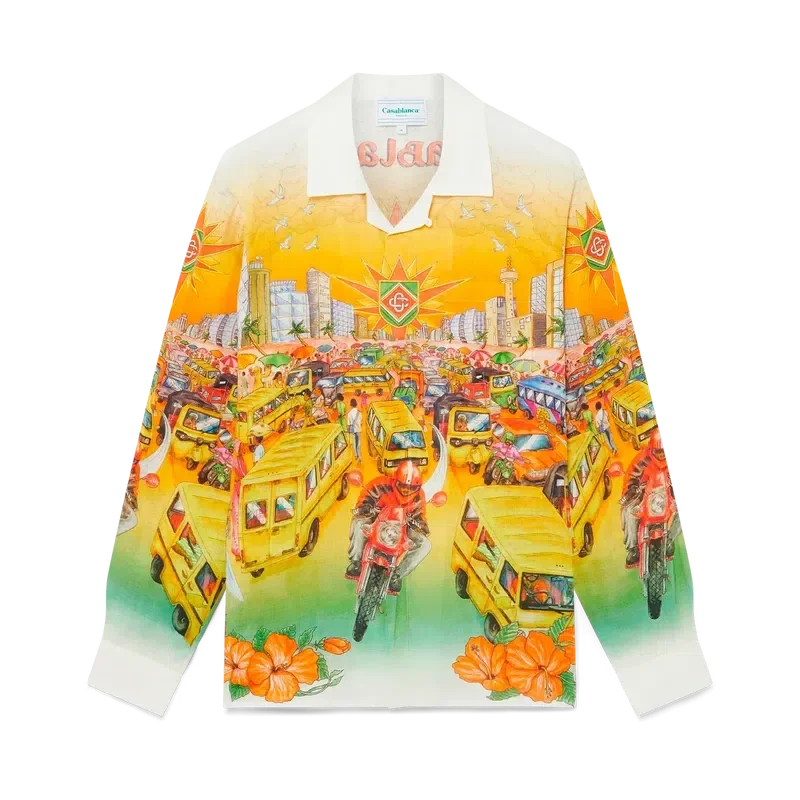 Traffic-linne-skjorten er en langermet modell med heltrykk inspirert av Nigeria, med kunstverk som illustrerer hibiskusblomster, trafikk og et bylandskap mot de dype fargene i Lagos’ skyline. Komplett med kontrastkrage og mansjetter, knappelukking, brystlomme og karakteristiske emaljeknapper med gullkant.