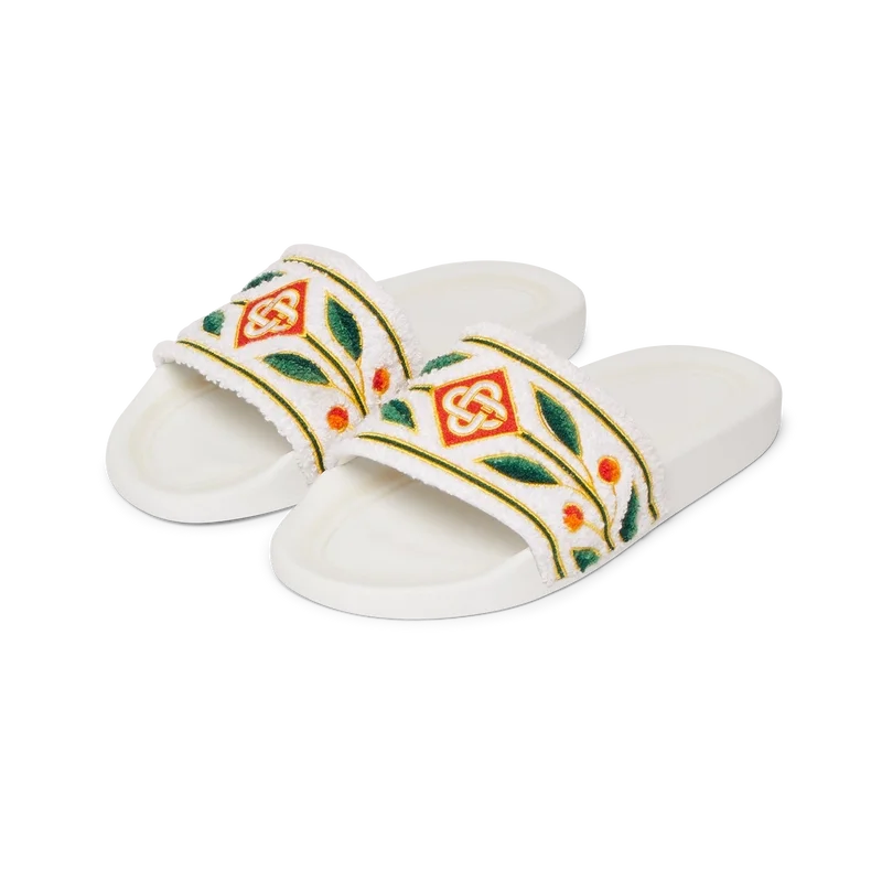 De broderte Terry Sliders for menn er laget av frotté og har husets diamantlogo og signatur Laurel-motiv på overdelen. Fullført med en formet fotbed for økt komfort og en strukturert gummiert såle som kombinerer ytelse med fritid.