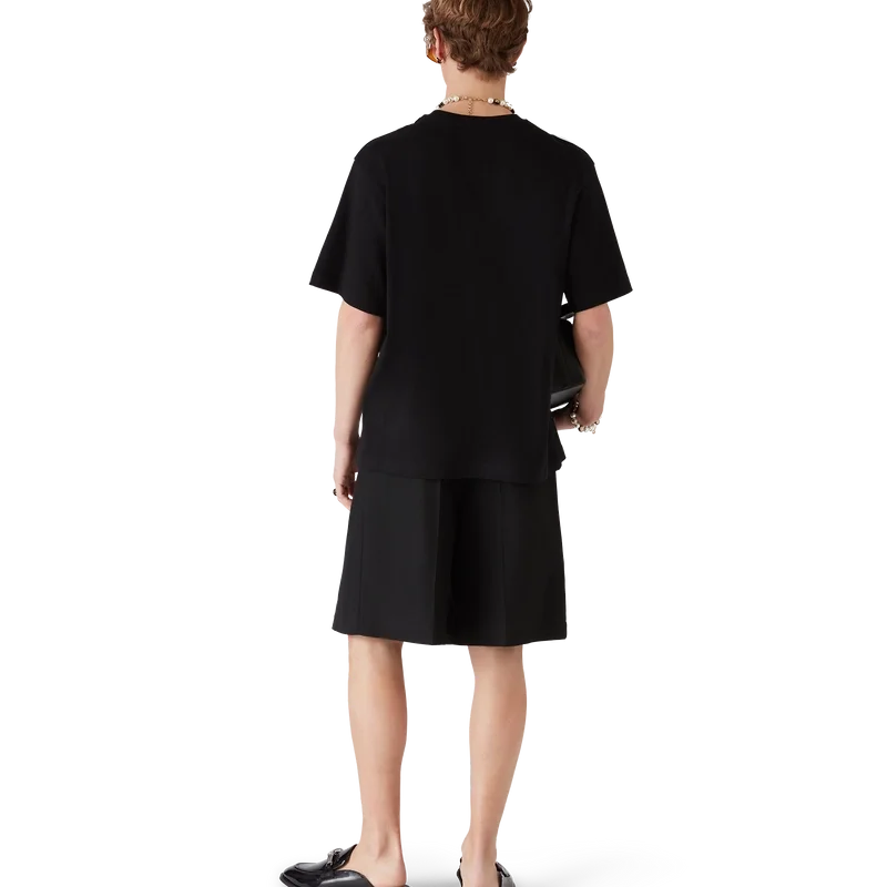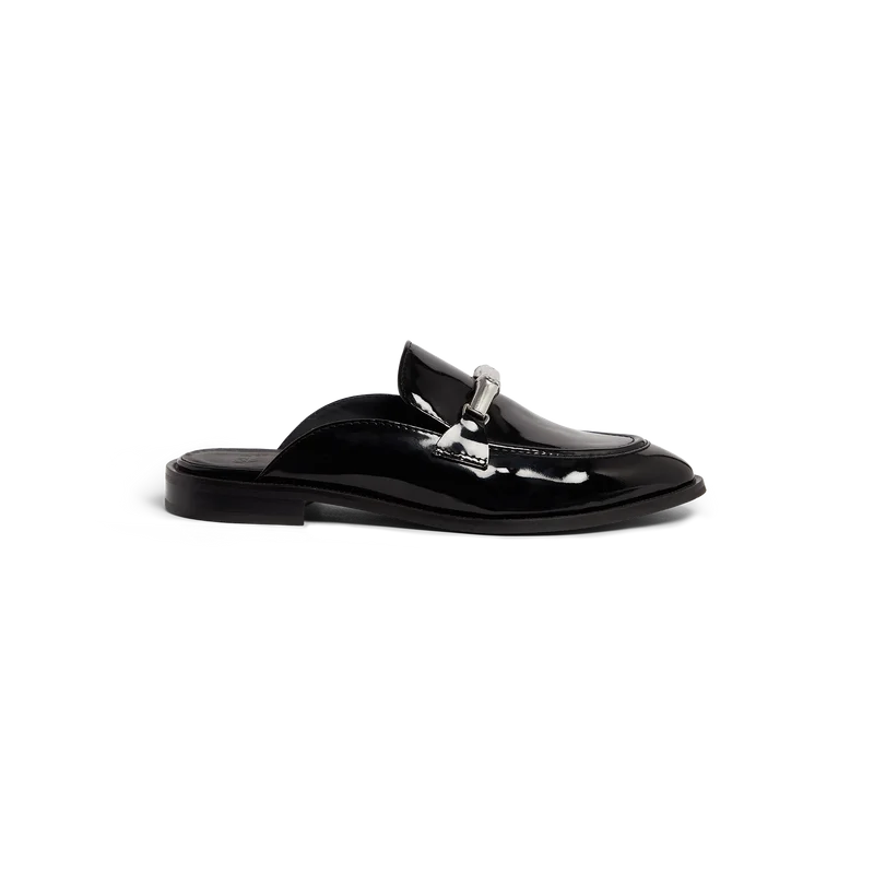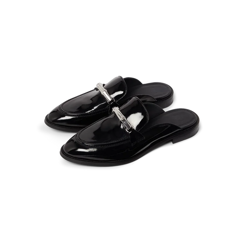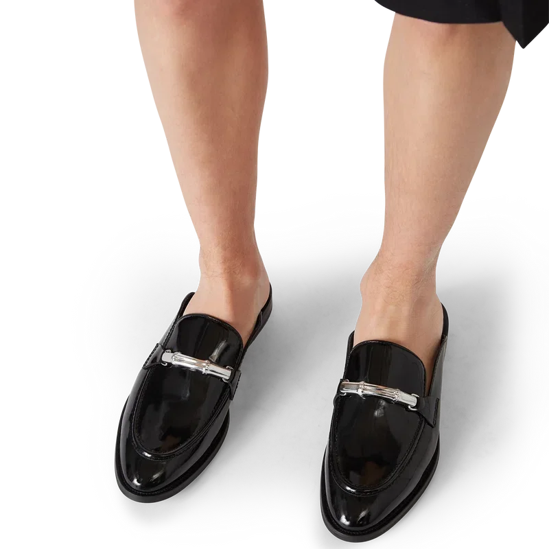 Den svarte Bamboo Slip-on Loafer er en flat, åpen tå-modell uten hæl, laget av italiensk kalveskinn. Fullført med vår ikoniske bambusrem, skinnfôr, skinnsåle, gullbelagte detaljer og en 10 mm blokkhæl.