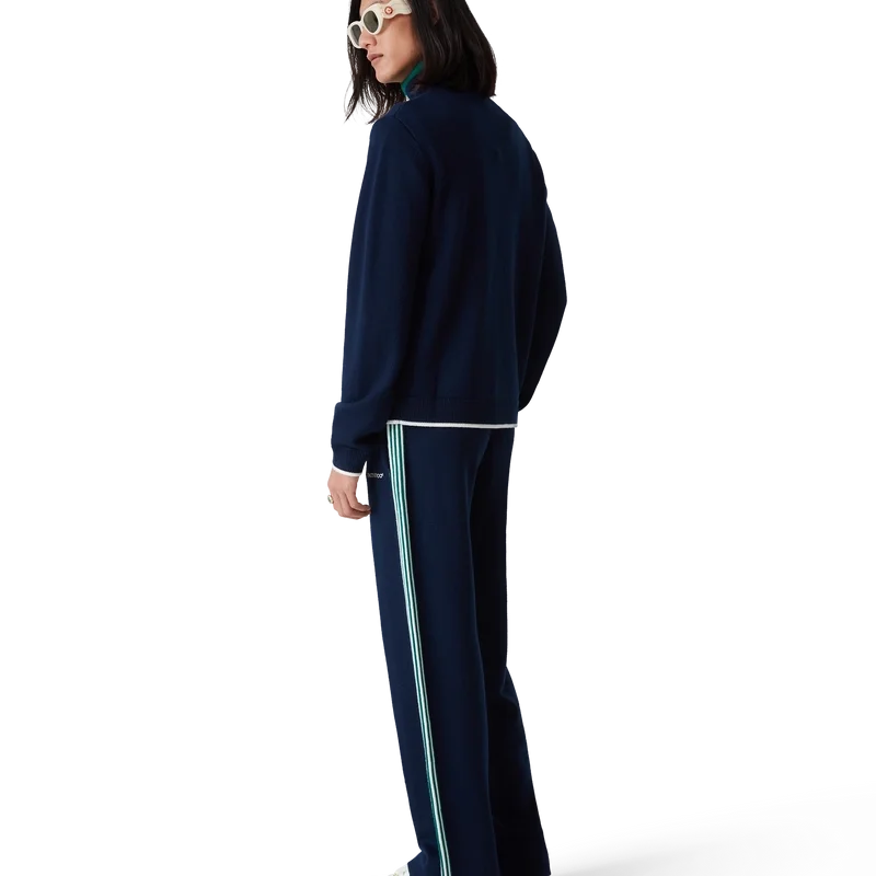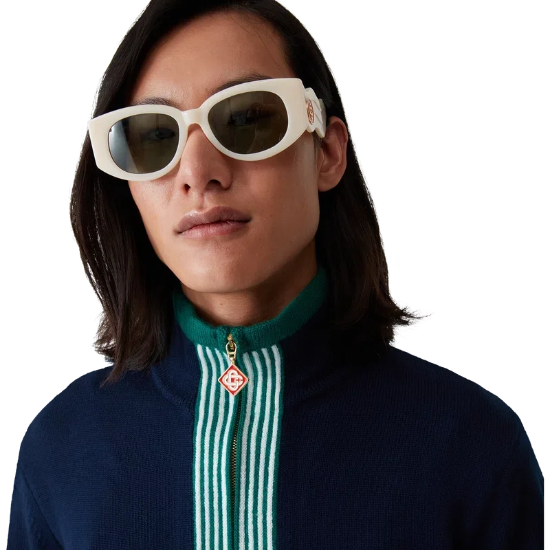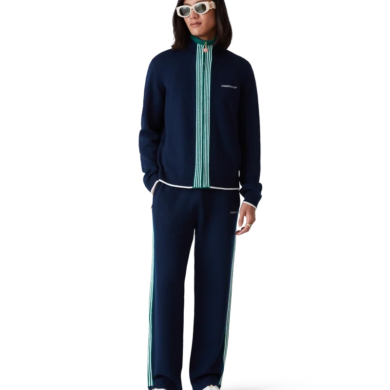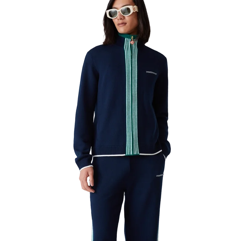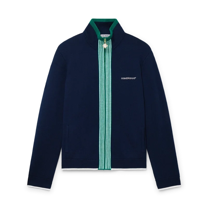 Den strikkede tennisjakken har et klassisk design og er laget av merinoull. Den har kontrastfargede ribbede kanter på mansjetter, nederkant, knappelukking og tragtkrage, glidelås foran og Casablanca-logo.