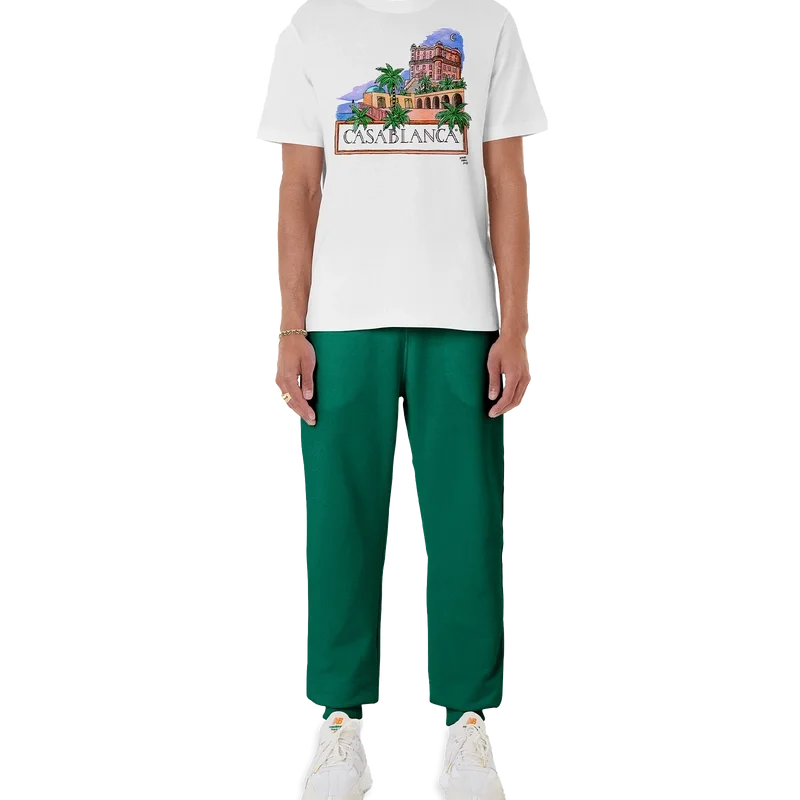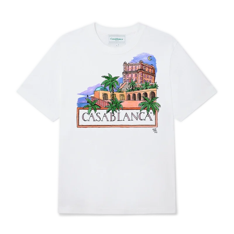 Amour Maroc-T-skjorten i økologisk bomull har et av merkets mest ikoniske kunstverk, «Maison», som først ble lansert i 2019. Den har en klassisk rund hals, korte ermer og et Casablanca Paris-merke, og er designet for en avslappet passform.