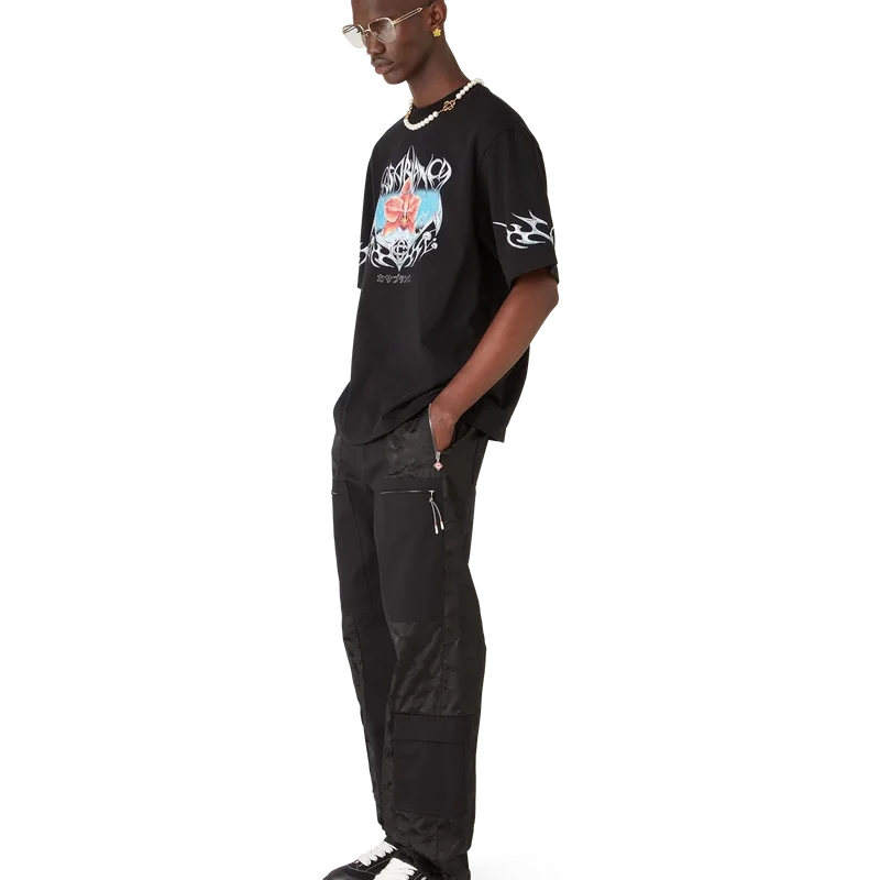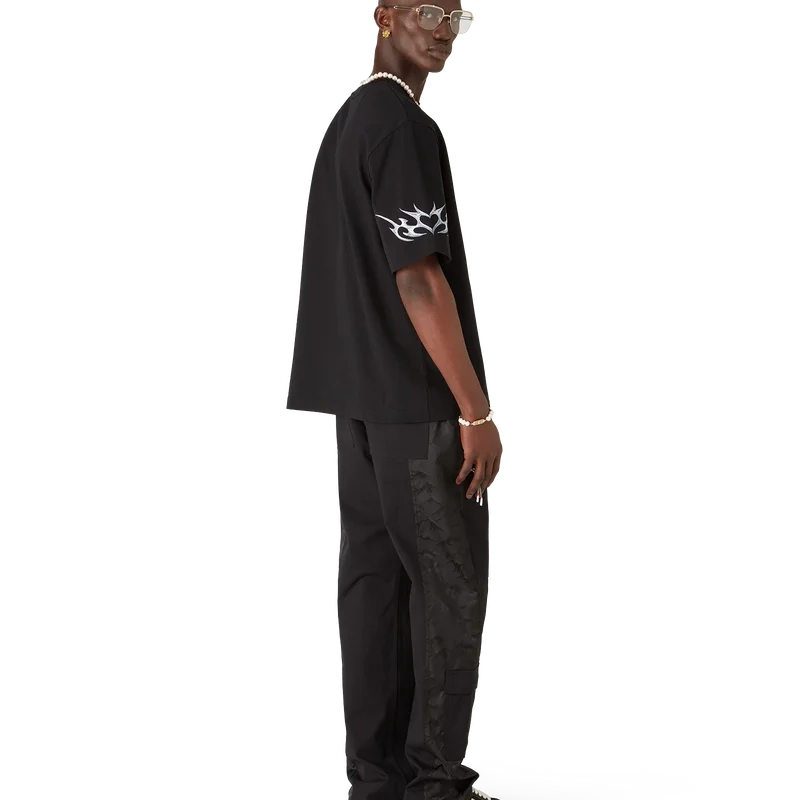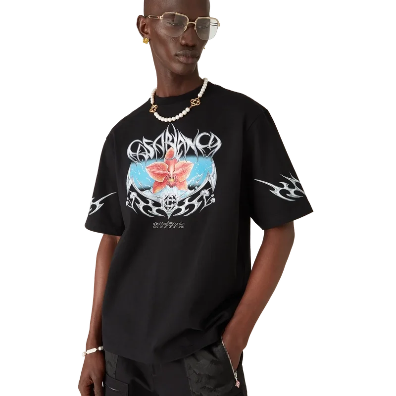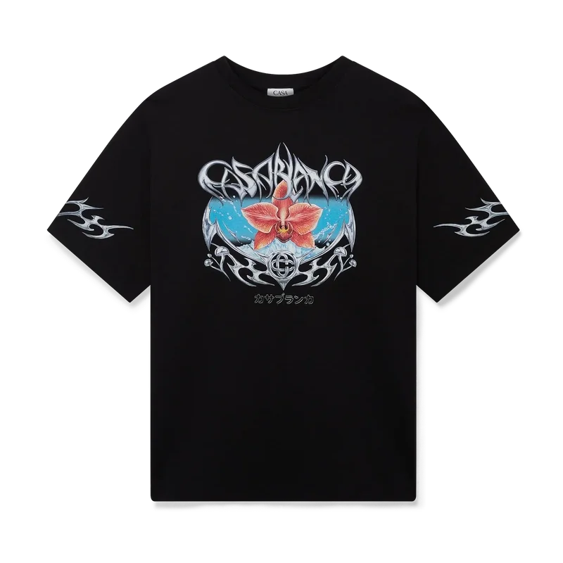 Blades Oversized T-skjorte har et trykt design med kunstverk som leker med kontrasten mellom to motstridende følelser – skarpheten til bladet og det kalde, sølvfargede kromet, i kontrast til naturens varme, som de dristige rosa og røde tonene i en orkideblomst. Tilsetningen av vann gir designet et friskt og sprøtt element. Fullført med en klassisk rund hals.