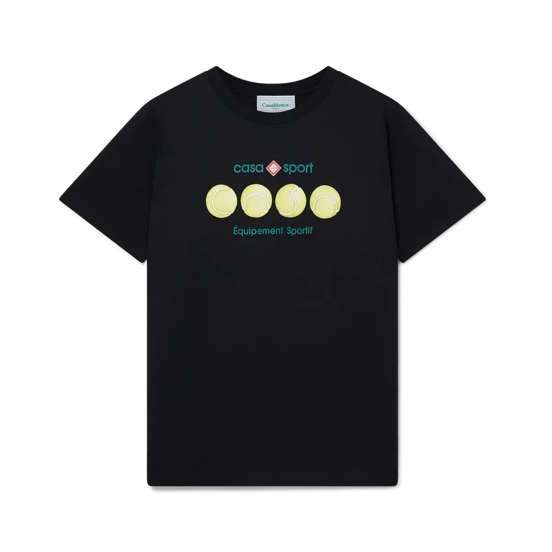Casa Sport Tennis Balls-T-skjorten i økologisk bomull med silketrykk har sesongens motiv som inkorporerer husets signaturtennis og Casa Sport-ikonografi.
