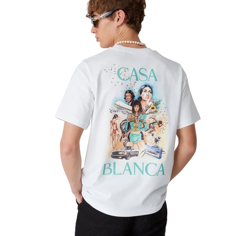 Celebration Du Sport T-skjorte er en kortærmet T-skjorte med trykk, laget av økologisk bomullsstoff med sesonginspirert kunstverk inspirert av husets lek med et klassisk filmplakatoppsett med våre karakterer i den verdenen. Fullført med en klassisk rund hals.