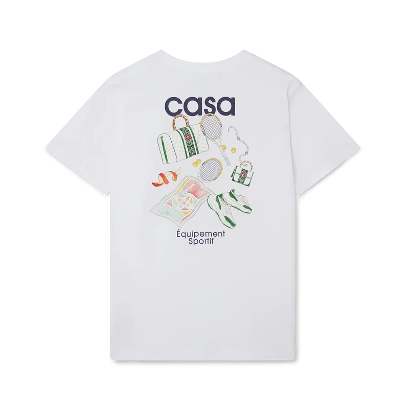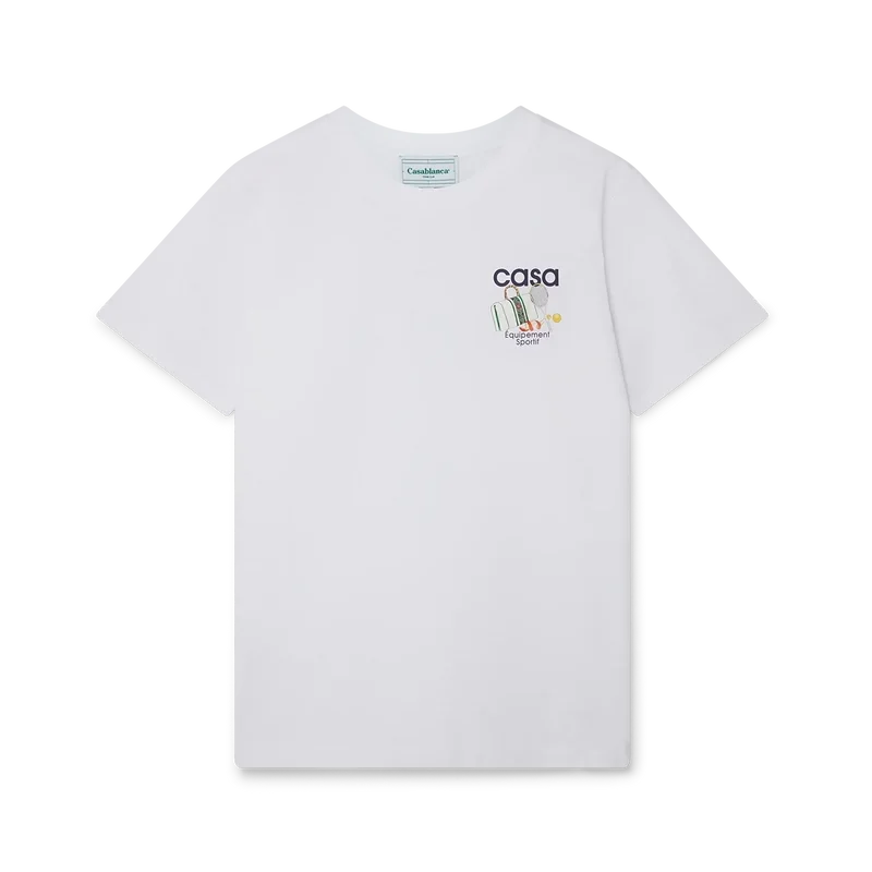 Equipement Sportif T-skjorten har et trykk av husets signaturkunstverk, nyfortolket for denne sesongen, på venstre bryst og gjentatt i et større trykk på ryggen. Laget av 100 % økologisk bomull og fullført med en klassisk rund hals og Casablanca-merkelapp.