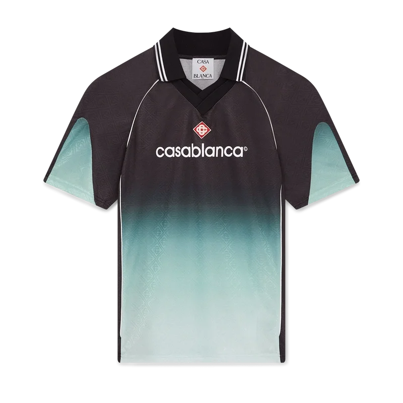 Jacquard Gradient-fotballskjorten er en kortærmet modell i fargene fra Park Hyatt – et ikonisk hotell i Tokyo som bruker mintgrønt og svart i interiøret – og er laget av jacquard-monogramstoff med fargeovergang. Den er utstyrt med husets karakteristiske diamantlogo-merke, ribbestrikket krage og et Casablanca-logo på brystet.