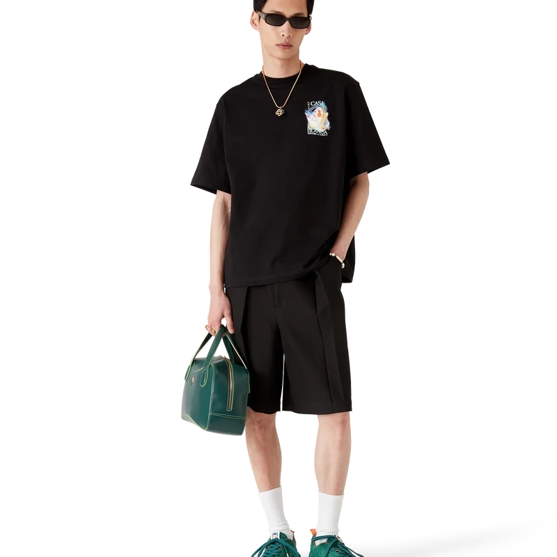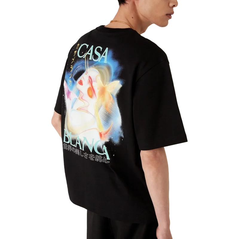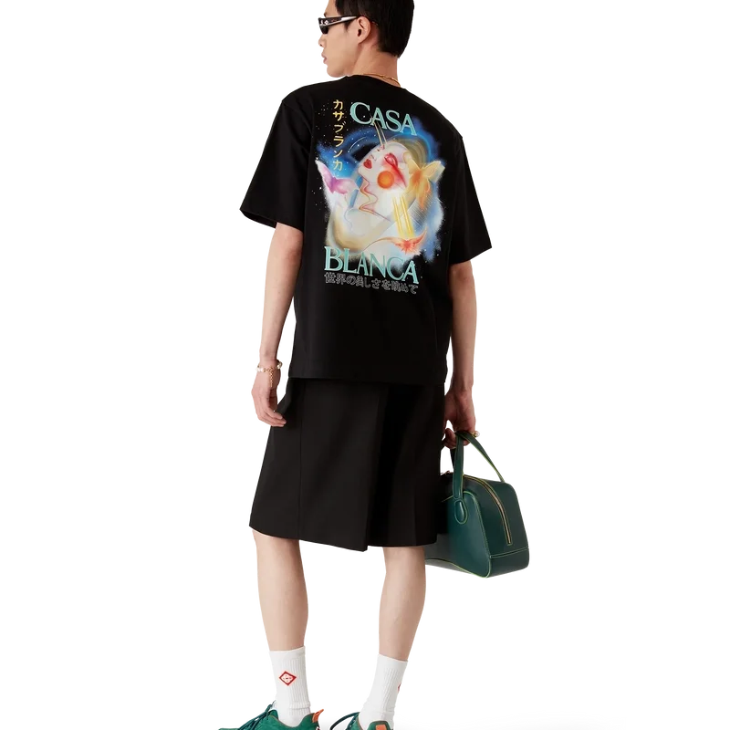 Galactic Connection T-skjorte er en kortærmet T-skjorte med trykk, laget av økologisk bomull, med husets sesongbaserte airbrush-kunstverk – inspirert av Pater Sato. Med Galactic Connection utforsker vi hvem de bioniske vesener i Casablanca ville være, samtidig som vi beholder fjellelementene i bakgrunnen. Fullført med en klassisk rund hals.