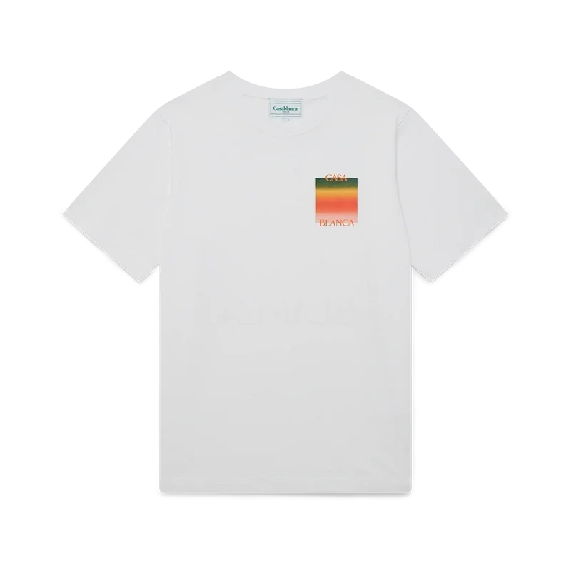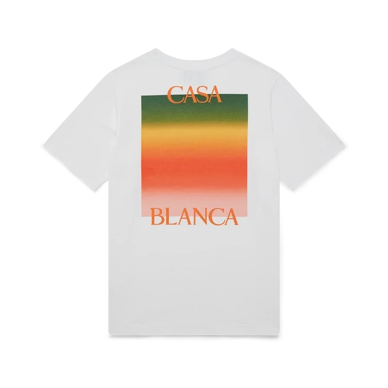 Gradient Casa Logo T-skjorte er en kortærmet T-skjorte med trykk som viser sesongens gradientfarger, som representerer det rike utvekslingen på tvers av kulturelle disipliner innen afrikansk kunst, musikk og film. Laget av økologisk bomull og med klassisk rund hals.