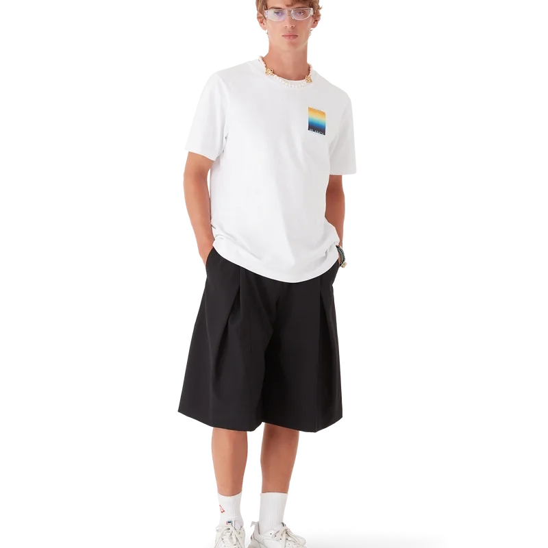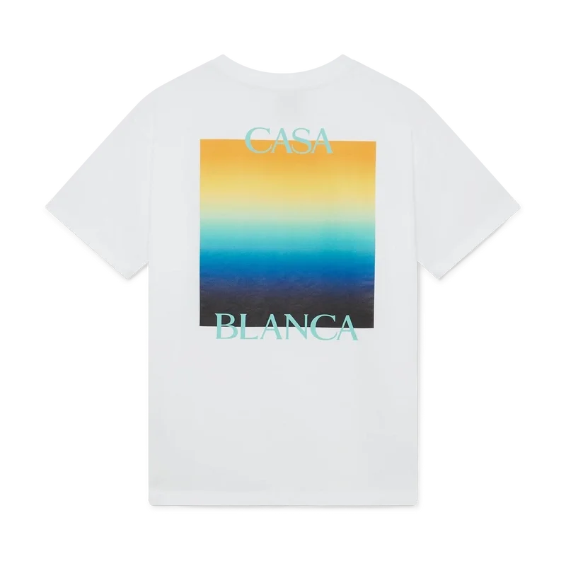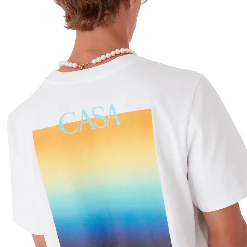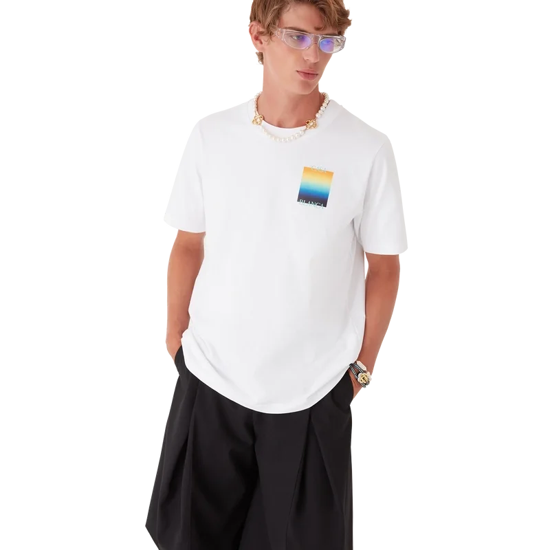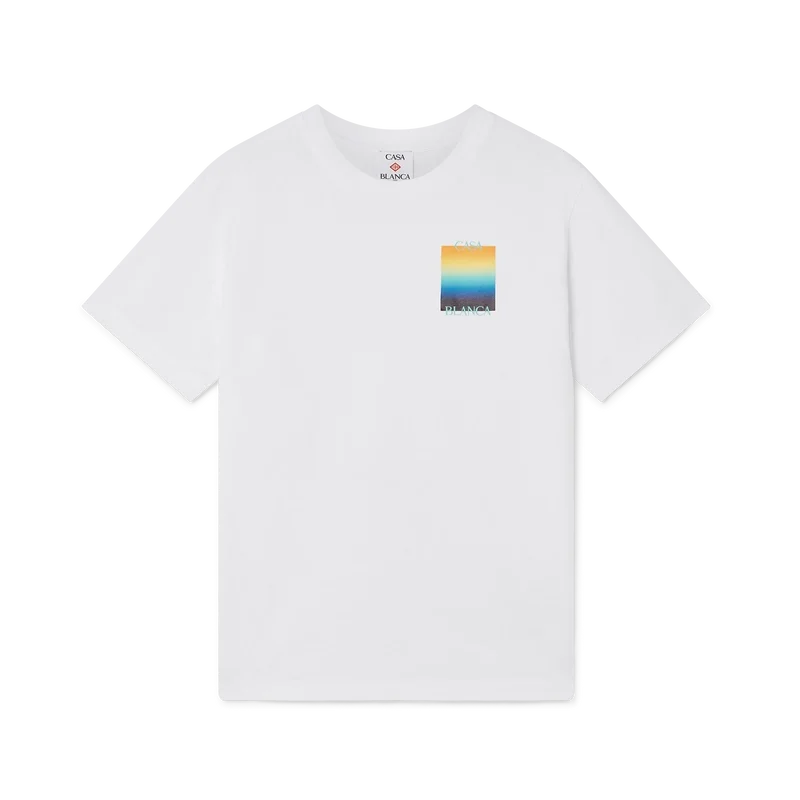 Gradient Square T-skjorten er en kortærmet T-skjorte med trykk som viser husets stablede logo og sesongens gradientfirkant – i vår tradisjon for å tolke naturens kraftfulle fargepaletter på nytt – Vår sesongbaserte gradient er inspirert av de levende og slående naturlige fargene til pilgiftfrosker. De dristige nyansene fra blått til gult symboliserer en advarsel i naturen, og brukes med samme intensjon om å fange oppmerksomheten i våre trykk. Laget av økologisk bomullsstoff og fullført med en klassisk rund hals.