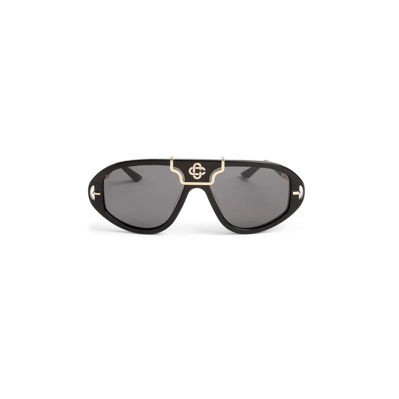Hacienda-solbrillenes dristige sort- og gullfargede acetatstruktur kjennetegner disse rektangulære solbrillene. Her er det karakteristiske Casablanca-Diamond Monogram-logoen plassert på broen. De grå linsene gir 100 % UV-beskyttelse, og stilen fullendes med en Casablanca-eske, rengjøringsklut og garantibrosjyre.