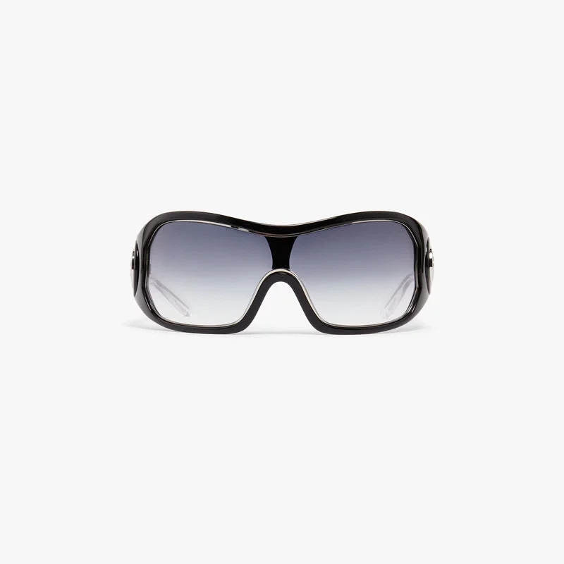 Black Outline Shield-solbrillene er laget av acetat og metall i en wraparound-ramme, med en elegant, arkitektonisk silhuett. De grå gradientlinsene gir 100 % UV-beskyttelse, og modellen fullendes med husets sølvfargede, sammenflettede CC-logo på brillestengene for en raffinert finish.