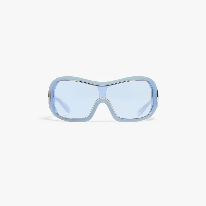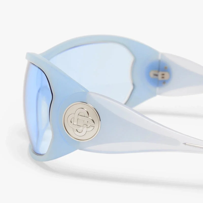 Blue Outline Shield-solbrillene er laget av acetat og metall i en wraparound-ramme, med en elegant, arkitektonisk silhuett. De blå gradientlinsene gir 100 % UV-beskyttelse, og stilen fullendes med husets sølvfargede, sammenflettede CC-logo på brillestengene for en raffinert finish.