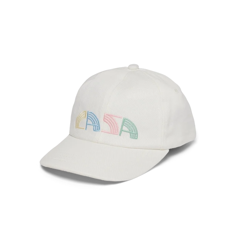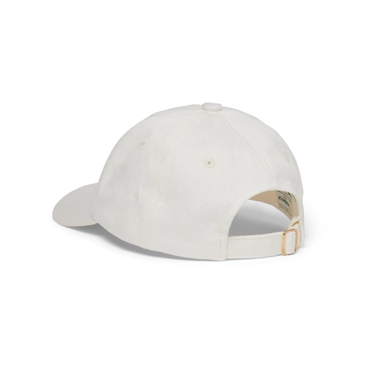 Den off-white Casa Deco-capsen med broderi har samarbeidets doble merke. Den har en justerbar gullfarget borrelås på baksiden.