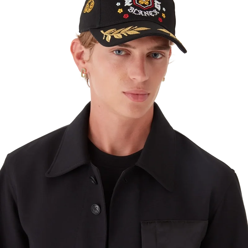 BōSōZoku-capsen med brodert laurbærkrans er en klassisk baseballcap laget av bomullstwill med sesongens kunstverk, hvor vi hentet inspirasjon fra den japanske subkulturen BōSōZoku til et av våre hovedtemaer. Kontrasten mellom grafiske elementer og tekst føltes veldig Casablanca for oss. Layouten er ukonvensjonell, men komposisjonen er nøye balansert, noe som gir den en unik, men harmonisk følelse. Fullført med en skygge med detaljer i form av et gull-laurbærblad og en gullbelagt, justerbar spenne.