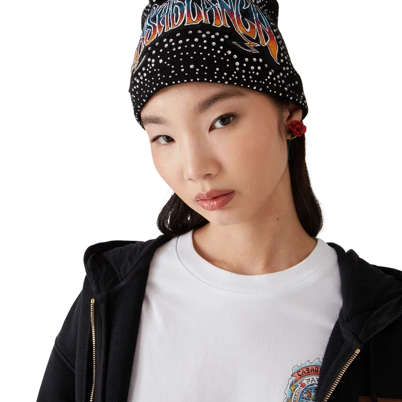 Gothic Crystal Embellished Beanie er en vevd lue laget av ullstoff med krystallperledetaljer. Fullført med brodert, håndtegnet typografi av Casablanca-logoen, inspirert av den gotiske skrifttypen som brukes i tatoveringer.