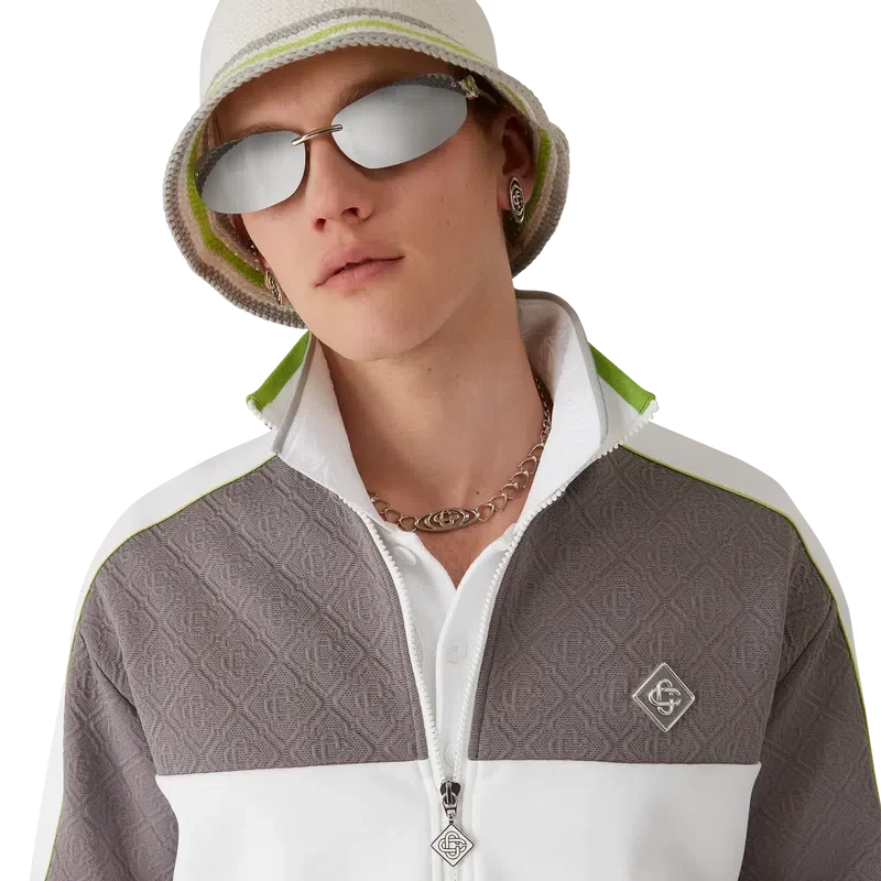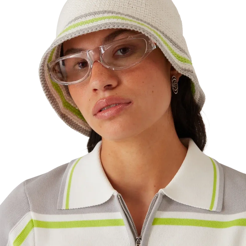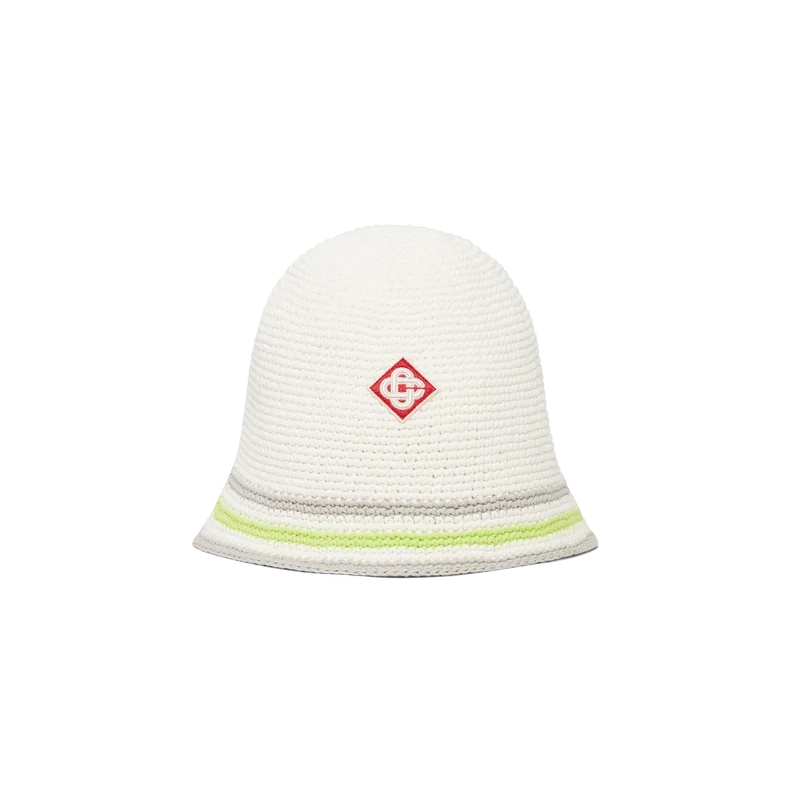 Den stripete heklede hatten har en klassisk bøtteform og er laget av et mykt, strukturert heklet bomullsstoff med åpen veving – det ultimate sommerplagget. Den har en grønn, grå og hvit stripete brem og en Casablanca Glass-logoapplikasjon i midten.
