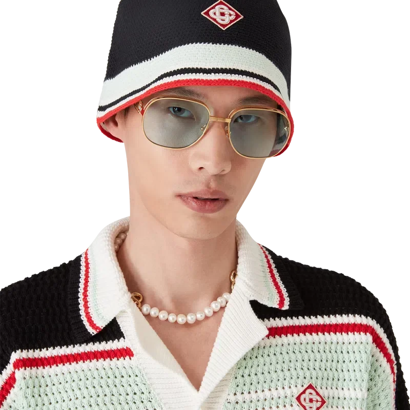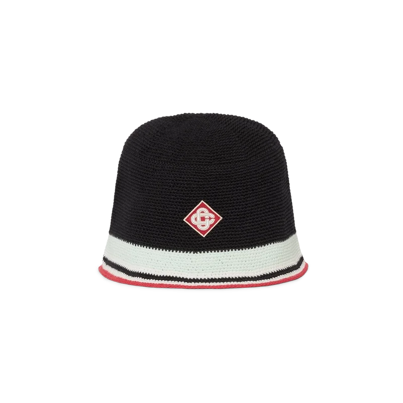Den stripete heklede hatten er en bøttehatt laget av et mykt, strukturert bomullsstoff med åpen veving – det ultimate sommerplagget. Fullført med en blå, rød, mintgrønn og hvit stripet brem og et Casablanca-Diamond Monogram i midten.