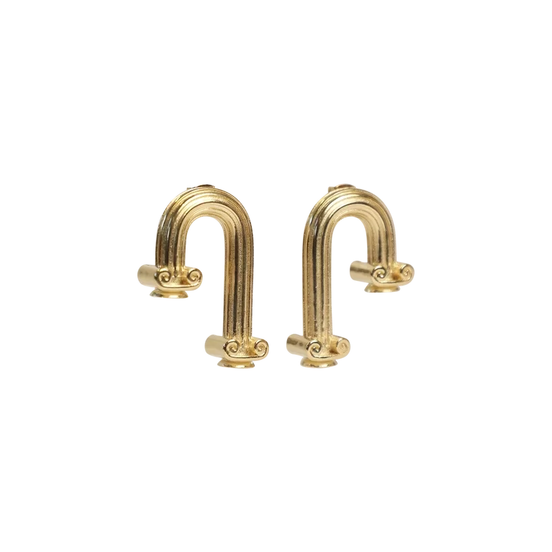 Arch Column-øreringene gjenspeiler sesongens antikke greske tema. Laget av forvrengte greske søyler i gullbelagt messing. Designet for hull i ørene.