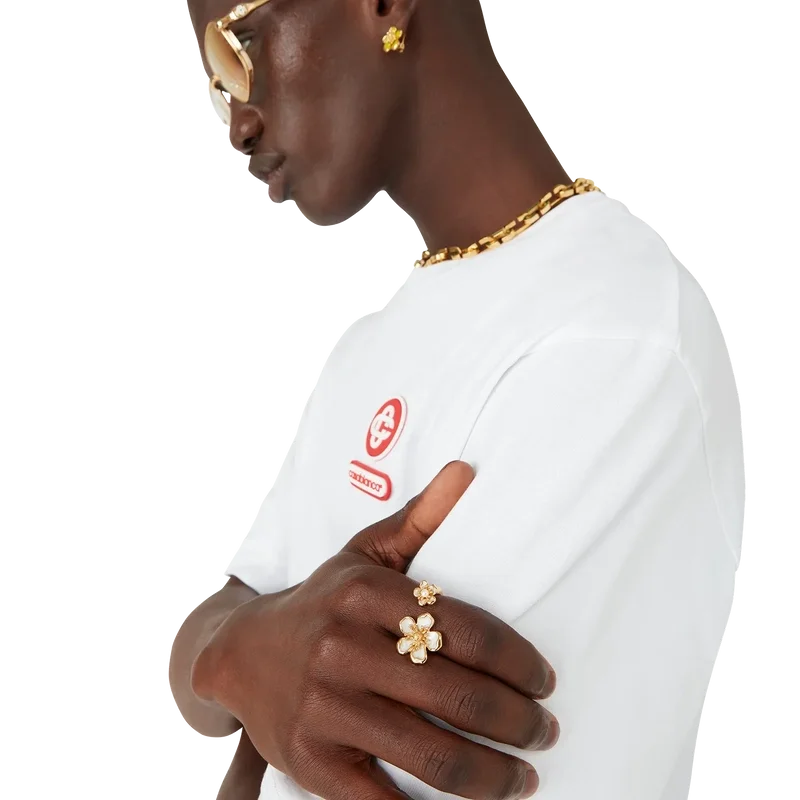 Blomsterringen er designet i stil med to blomster i forskjellige størrelser og er laget av gullbelagt messing og emalje. Denne varen leveres med en Casablanca-støvpose, eske og en produktbrosjyre.
